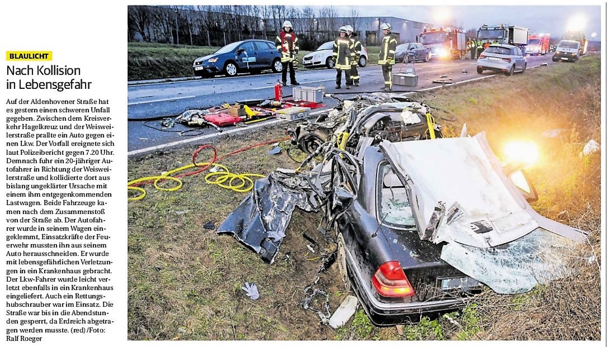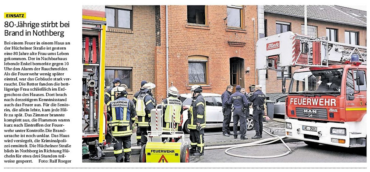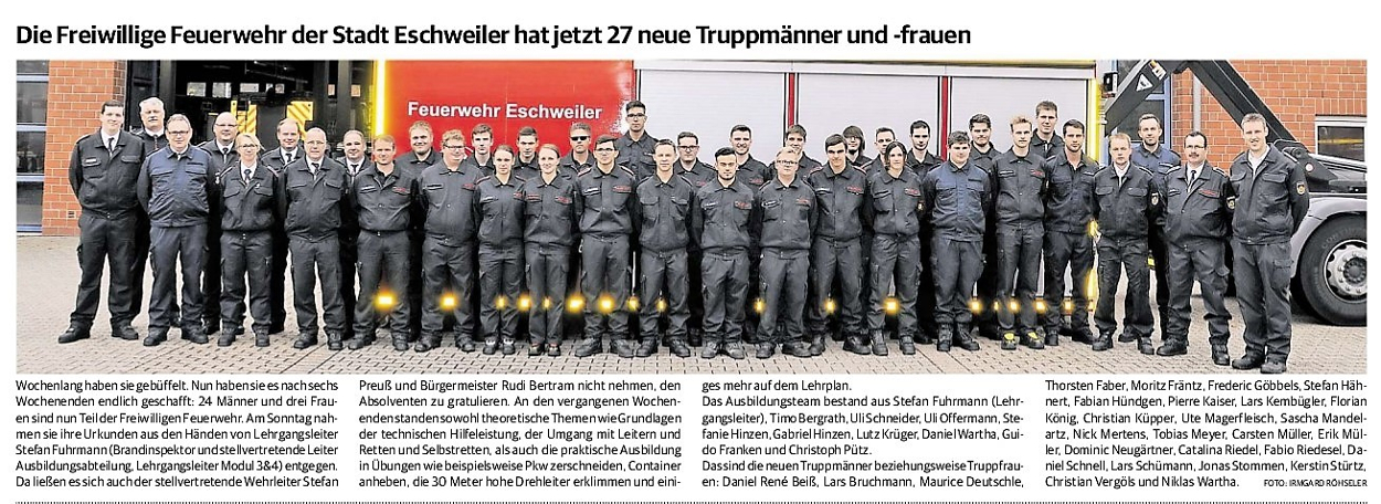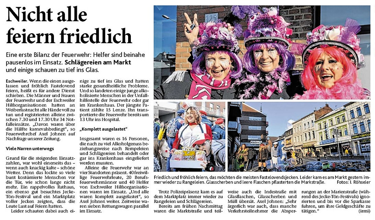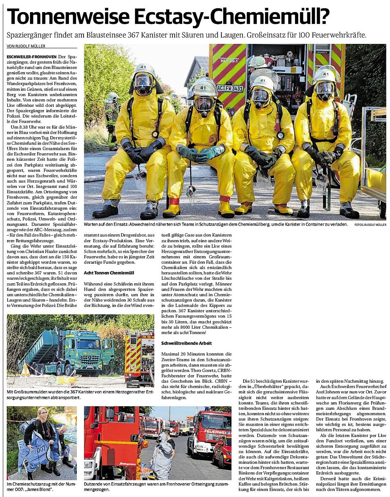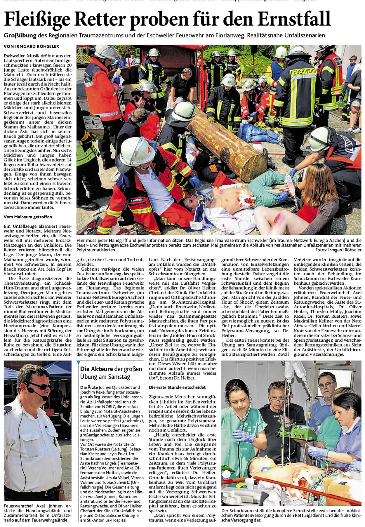 2018 31.12.2018 80-Jährige stirbt bei Brand in Nothberg EN / EZ 31.12.2018 Wenn Retter selbst zu Opfern werden EN / EZ 20.12.2018 Nach Kollision in Lebensgefahr EN / EZ 28.11.2018 Kurz Notiert - Rote Ampel übersehen EN / EZ 10.11.2018 Frontalzusammenstoß in Kinzweiler EN / EZ 08.11.2018 Auch ein Held braucht manchmal Hilfe EN / EZ 08.11.2018 Brandmeisterbewerbung mit Drehleiterübung EN / EZ 01.11.2018 Brandstiftung? Drei Autos brennen in Stich EN / EZ 24.10.2018 Hausfassade in Brand geraten EN / EZ 19.10.2018 Jahrestreffen der Ehrenabteilungen des Kreises EN / EZ 15.10.2018 20 jähriger fährt auf Motorradgruppe EN / EZ 10.10.2018 Abschluss Grundlehrgang Modul EN / EZ 04.10.2018 Jugendfeuerwehr - Gemeinsam im Ernstfall EN / EZ 01.10.2018 Die zwölfte Auflage des B 1 - Lehrgangs EN / EZ 29.09.2018 Verwaltung umstrukturiert - Amt 37 EN / EZ 27.09.2018 Tonnenweise Ecstasy-Chemiemüll? EN / EZ 19.09.2018 Von Lagerhalle bleibt nur Gerippe übrig EN / EZ 04.09.2018 Löschzug 21 - Tag der Feuerwehr EN / EZ 30.08.2018 Kreisbrandmeister Bernd Hollands EN / EZ 28.08.2018 Rauchwolke erreicht Eschweiler EN / EZ 24.08.2018 Feuer zu löschen, ist inzwischen Ausnahme EN / EZ 22.08.2018 Zwei neue Einsatzfahrzeuge EN / EZ 10.08.2018 Und plötzlich bricht die Fassade weg EN / EZ 26.07.2018 Zwischen Vorsatz und Fahrlässigkeit EN / EZ 25.07.2018 Hitzewelle und Waldbrandgefahr EN / EZ 24.07.2018 Wehrleute bei einem dreitägigen Seminar EN / EZ 21.07.2018 Nächtlicher Schwimmer löst Großalarm aus EN / EZ 11.07.2018 Ein Unfall, der sich gewaschen hat EN / EZ 09.07.2018 Ein Flammenmeer im dritten Stock EN / EZ 06.07.2018 86 Liter Säure laufen aus EN / EZ 04.07.2018 Es freut uns EN / EZ 27.06.2018 Akute Platznot in den Rettungswachen EN / EZ 26.06.2018 Feuer vernichtet Kranwagen und Trafo EN / EZ 22.06.2018 Die Feuerwehr bekommt ein eigenes Amt EN / EZ 21.06.2018 Zwei schwere Zusammenstöße mit Verletzten EN / EZ 21.06.2018 Triatlon-Training löst Feuerwehreinatz aus EN / EZ 19.06.2018 Leistungsnachweis der Städteregion EN / EZ 05.06.2018 Unfall auf der Aachener Straße EN / EZ 28.05.2018 Garagenbrand in Dürwiß EN / EZ 01.05.2018 Überflutete Straßen und Keller EN / EZ 23.04.2018 Retter proben den Ernstfall EN / EZ 23.04.2018 Auffahrunfall zweier Busse und Hallenbrand EN / EZ 13.04.2018 Einladung - 6. Rettungsübung am Florianweg EN / EZ 10.04.2018 Der 13. Interkommunale B1-Lehrgang startet EN / EZ 09.04.2018 Dicke Luft in der Indestadt EN / EZ 03.04.2018 Lagerhalle an der Grachtstraße Raub der Flammen EN / EZ 23.03.2018 Verpuffung im Elektrowerk Weisweiler EN / EZ 23.03.2018 Jahreshauptversammlung der Feuerwehr Eschweiler EN / EZ 16.03.2018 Jahreshauptversammlung der Jugendfeuerwehr EN / EZ 10.03.2018 Hohe Einsatzzahlen des Rettungsdienstes EN / EZ 24.02.2018 Kamin steht in Flammen EN / EZ 20.02.2018 Kurz Notiert - Feuer in Hastenrath EN / EZ 14.02.2018 Reizgasangriff am Markt EN / EZ 12.02.2018 Prinzenempfang mit Überraschungen EN / EZ 12.02.2018 Retter der Feuerwehr im Dauereinsatz EN / EZ 10.02.2018 Vor allem am Markt alle Hände voll zu tun EN / EZ 09.02.2018 Nicht alle feiern friedlich EN / EZ 06.02.2018 Kurz Notiert - Zwei Verletzte auf der A 4 EN / EZ 03.02.2018 Kurz Notiert - Essen angebrannt EN / EZ 27.01.2018 Kurz Notiert - Bei Unfall schwer verletzt EN / EZ 24.01.2018 Liebes Tagebuch - Gerätehaus Dürwiß EN / EZ 19.01.2018 Sturm hinterlässt Sach- und Dachschaden EN / EZ 18.01.2018 Abschleppwagen ein Raub der Flammen EN / EZ 12.01.2018 Nach einem Jahr Rauchmelderpflicht EN / EZ 05.01.2018 Entwarnung erst nach 16 harten Stunden EN / EZ 04.01.2018 Tief "Burglind" EN / EZ 02.01.2018 Die Feuerwehr erlebt einen ruhigen Jahreswechsel EN / EZ