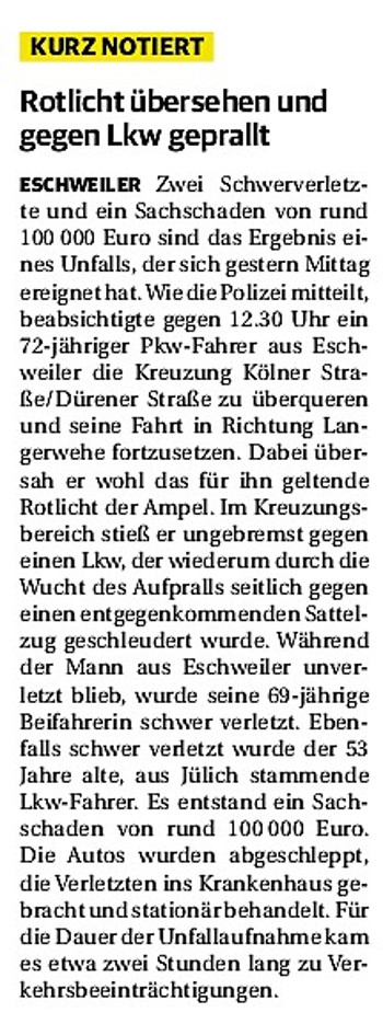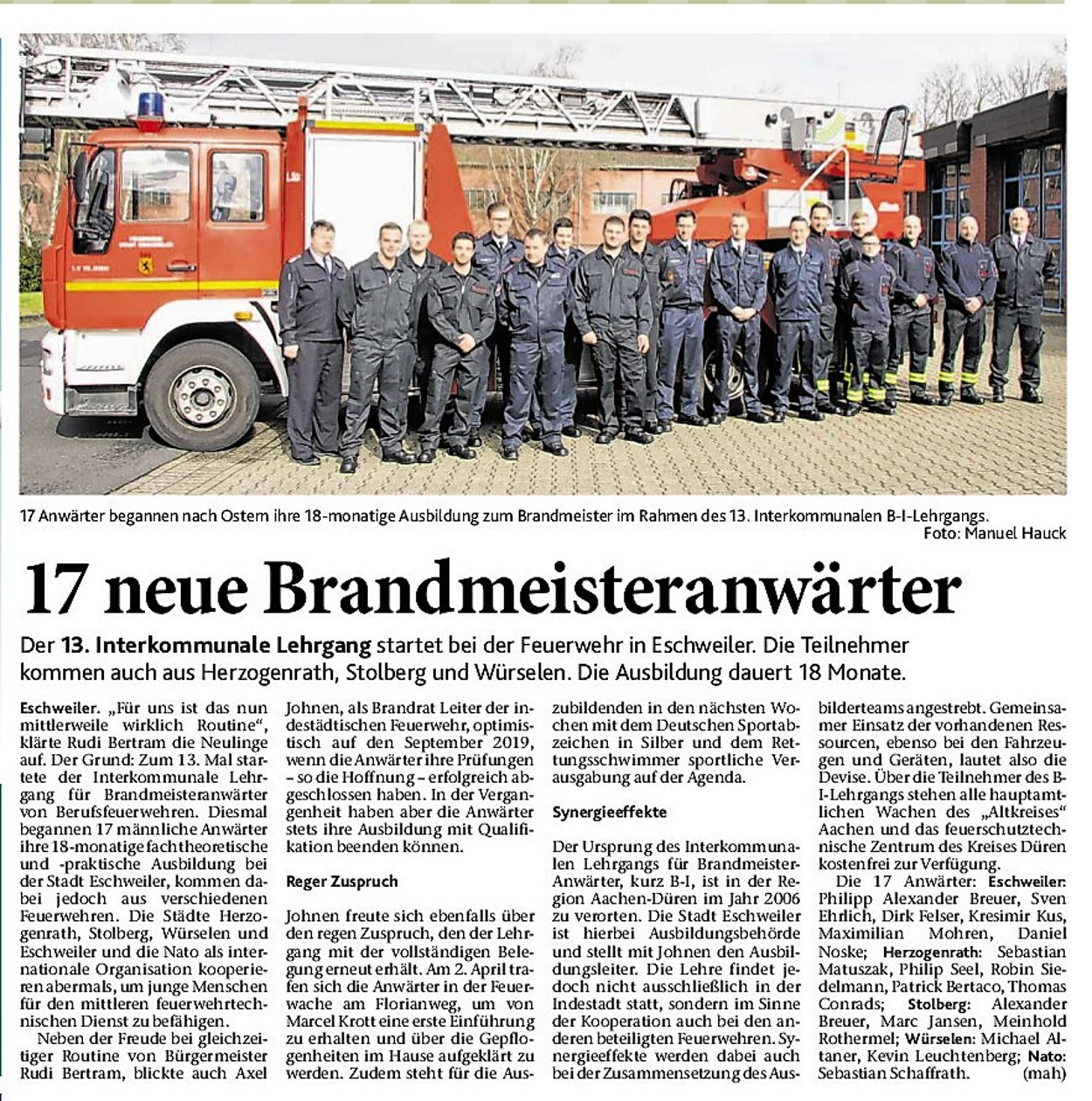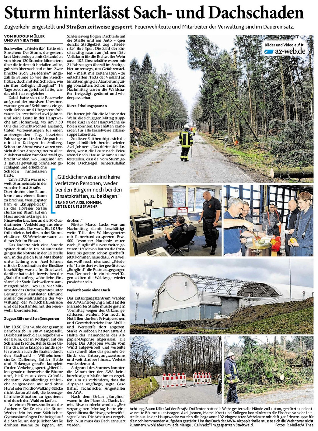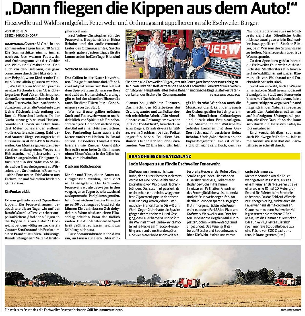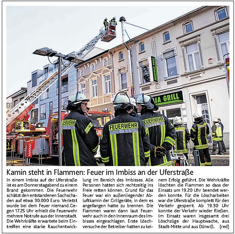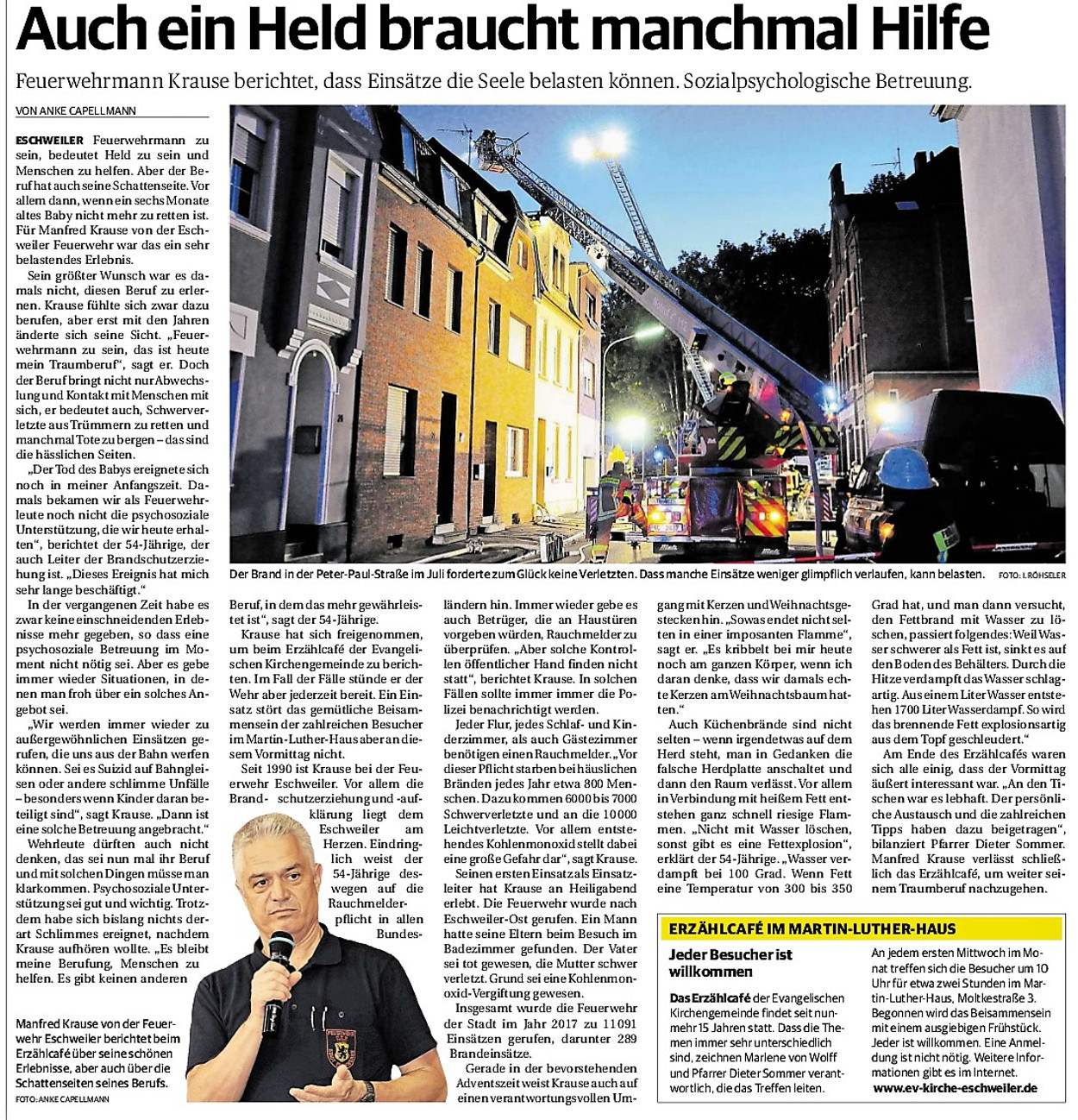 2018 31.12.2018 80-Jährige stirbt bei Brand in Nothberg EN / EZ 31.12.2018 Wenn Retter selbst zu Opfern werden EN / EZ 20.12.2018 Nach Kollision in Lebensgefahr EN / EZ 28.11.2018 Kurz Notiert - Rote Ampel übersehen EN / EZ 10.11.2018 Frontalzusammenstoß in Kinzweiler EN / EZ 08.11.2018 Auch ein Held braucht manchmal Hilfe EN / EZ 08.11.2018 Brandmeisterbewerbung mit Drehleiterübung EN / EZ 01.11.2018 Brandstiftung? Drei Autos brennen in Stich EN / EZ 24.10.2018 Hausfassade in Brand geraten EN / EZ 19.10.2018 Jahrestreffen der Ehrenabteilungen des Kreises EN / EZ 15.10.2018 20 jähriger fährt auf Motorradgruppe EN / EZ 10.10.2018 Abschluss Grundlehrgang Modul EN / EZ 04.10.2018 Jugendfeuerwehr - Gemeinsam im Ernstfall EN / EZ 01.10.2018 Die zwölfte Auflage des B 1 - Lehrgangs EN / EZ 29.09.2018 Verwaltung umstrukturiert - Amt 37 EN / EZ 27.09.2018 Tonnenweise Ecstasy-Chemiemüll? EN / EZ 19.09.2018 Von Lagerhalle bleibt nur Gerippe übrig EN / EZ 04.09.2018 Löschzug 21 - Tag der Feuerwehr EN / EZ 30.08.2018 Kreisbrandmeister Bernd Hollands EN / EZ 28.08.2018 Rauchwolke erreicht Eschweiler EN / EZ 24.08.2018 Feuer zu löschen, ist inzwischen Ausnahme EN / EZ 22.08.2018 Zwei neue Einsatzfahrzeuge EN / EZ 10.08.2018 Und plötzlich bricht die Fassade weg EN / EZ 26.07.2018 Zwischen Vorsatz und Fahrlässigkeit EN / EZ 25.07.2018 Hitzewelle und Waldbrandgefahr EN / EZ 24.07.2018 Wehrleute bei einem dreitägigen Seminar EN / EZ 21.07.2018 Nächtlicher Schwimmer löst Großalarm aus EN / EZ 11.07.2018 Ein Unfall, der sich gewaschen hat EN / EZ 09.07.2018 Ein Flammenmeer im dritten Stock EN / EZ 06.07.2018 86 Liter Säure laufen aus EN / EZ 04.07.2018 Es freut uns EN / EZ 27.06.2018 Akute Platznot in den Rettungswachen EN / EZ 26.06.2018 Feuer vernichtet Kranwagen und Trafo EN / EZ 22.06.2018 Die Feuerwehr bekommt ein eigenes Amt EN / EZ 21.06.2018 Zwei schwere Zusammenstöße mit Verletzten EN / EZ 21.06.2018 Triatlon-Training löst Feuerwehreinatz aus EN / EZ 19.06.2018 Leistungsnachweis der Städteregion EN / EZ 05.06.2018 Unfall auf der Aachener Straße EN / EZ 28.05.2018 Garagenbrand in Dürwiß EN / EZ 01.05.2018 Überflutete Straßen und Keller EN / EZ 23.04.2018 Retter proben den Ernstfall EN / EZ 23.04.2018 Auffahrunfall zweier Busse und Hallenbrand EN / EZ 13.04.2018 Einladung - 6. Rettungsübung am Florianweg EN / EZ 10.04.2018 Der 13. Interkommunale B1-Lehrgang startet EN / EZ 09.04.2018 Dicke Luft in der Indestadt EN / EZ 03.04.2018 Lagerhalle an der Grachtstraße Raub der Flammen EN / EZ 23.03.2018 Verpuffung im Elektrowerk Weisweiler EN / EZ 23.03.2018 Jahreshauptversammlung der Feuerwehr Eschweiler EN / EZ 16.03.2018 Jahreshauptversammlung der Jugendfeuerwehr EN / EZ 10.03.2018 Hohe Einsatzzahlen des Rettungsdienstes EN / EZ 24.02.2018 Kamin steht in Flammen EN / EZ 20.02.2018 Kurz Notiert - Feuer in Hastenrath EN / EZ 14.02.2018 Reizgasangriff am Markt EN / EZ 12.02.2018 Prinzenempfang mit Überraschungen EN / EZ 12.02.2018 Retter der Feuerwehr im Dauereinsatz EN / EZ 10.02.2018 Vor allem am Markt alle Hände voll zu tun EN / EZ 09.02.2018 Nicht alle feiern friedlich EN / EZ 06.02.2018 Kurz Notiert - Zwei Verletzte auf der A 4 EN / EZ 03.02.2018 Kurz Notiert - Essen angebrannt EN / EZ 27.01.2018 Kurz Notiert - Bei Unfall schwer verletzt EN / EZ 24.01.2018 Liebes Tagebuch - Gerätehaus Dürwiß EN / EZ 19.01.2018 Sturm hinterlässt Sach- und Dachschaden EN / EZ 18.01.2018 Abschleppwagen ein Raub der Flammen EN / EZ 12.01.2018 Nach einem Jahr Rauchmelderpflicht EN / EZ 05.01.2018 Entwarnung erst nach 16 harten Stunden EN / EZ 04.01.2018 Tief "Burglind" EN / EZ 02.01.2018 Die Feuerwehr erlebt einen ruhigen Jahreswechsel EN / EZ