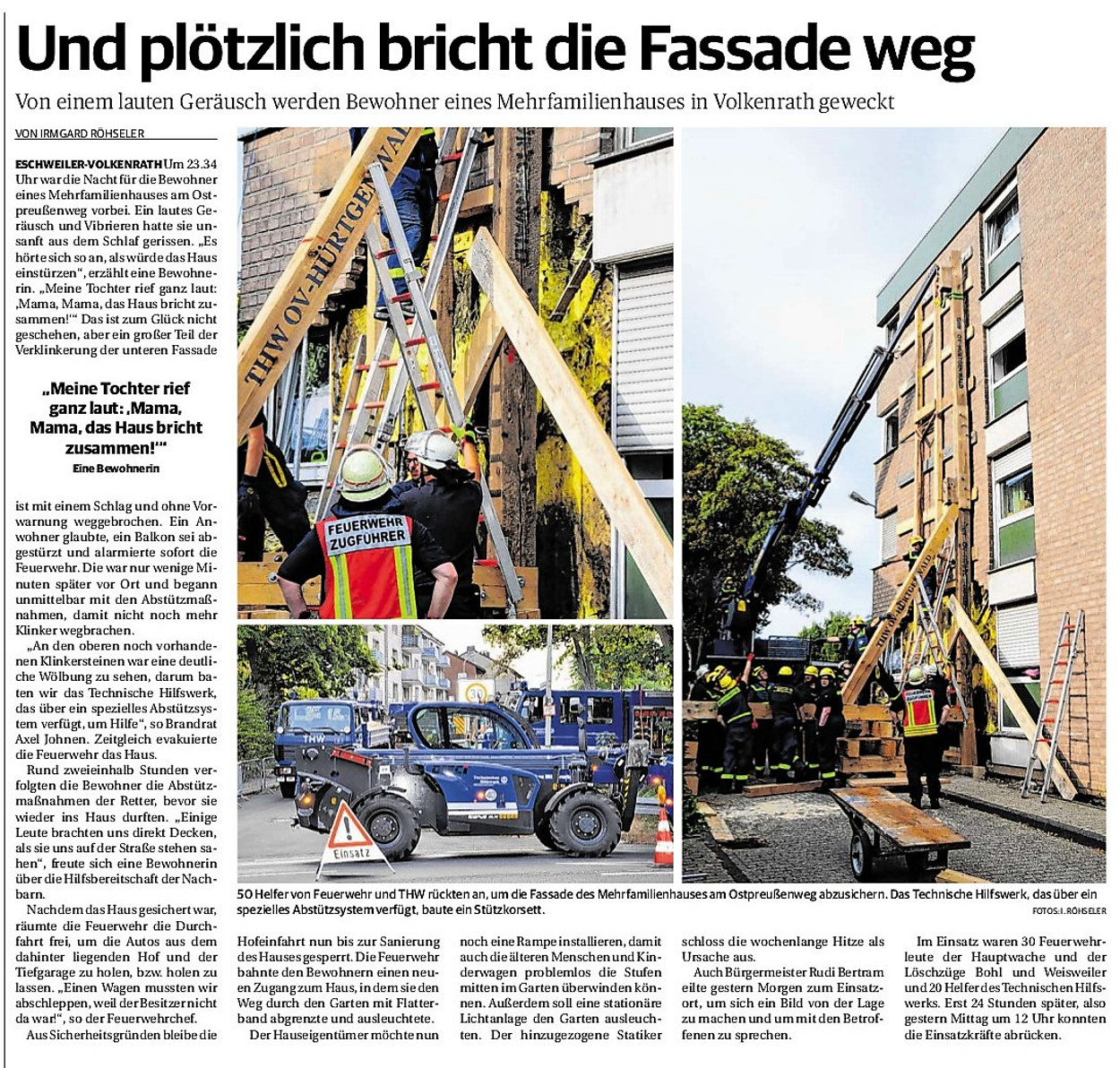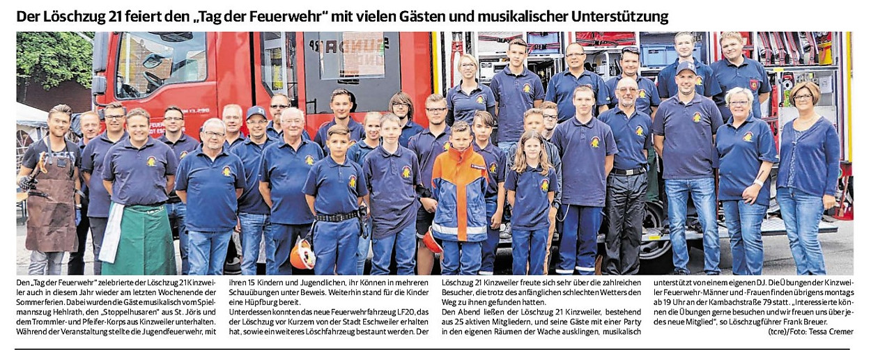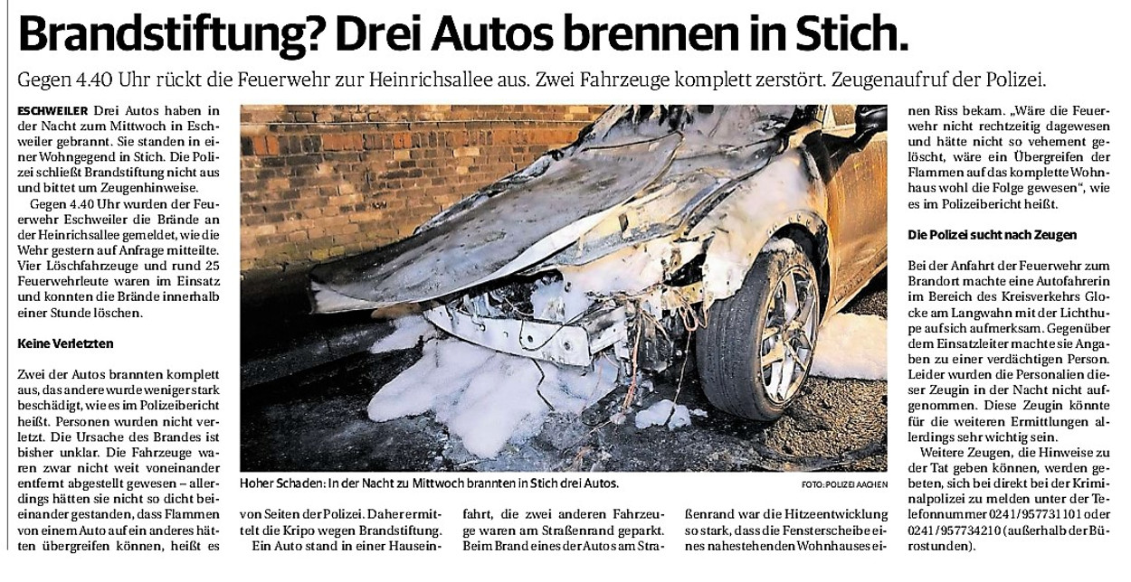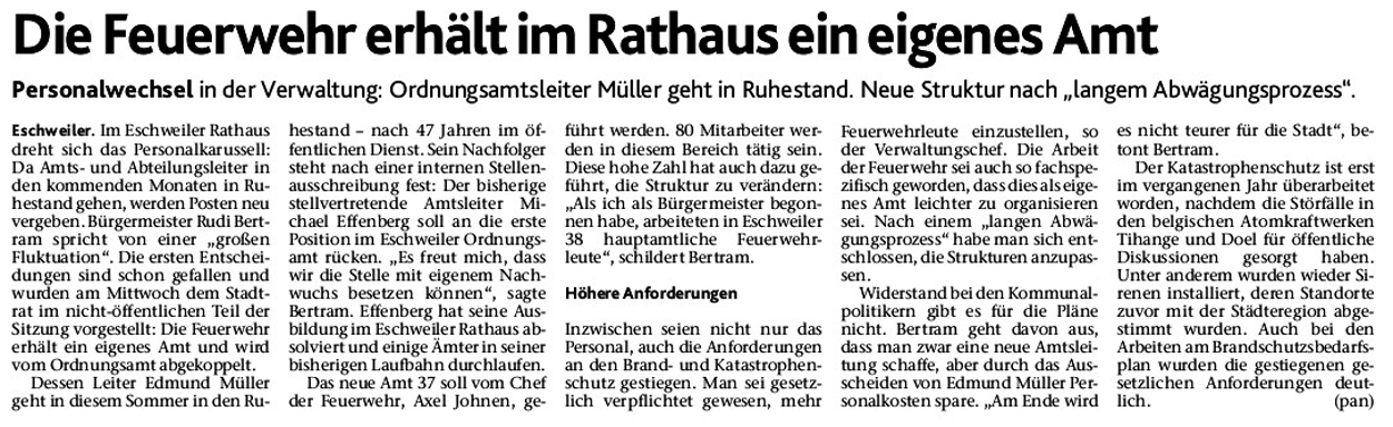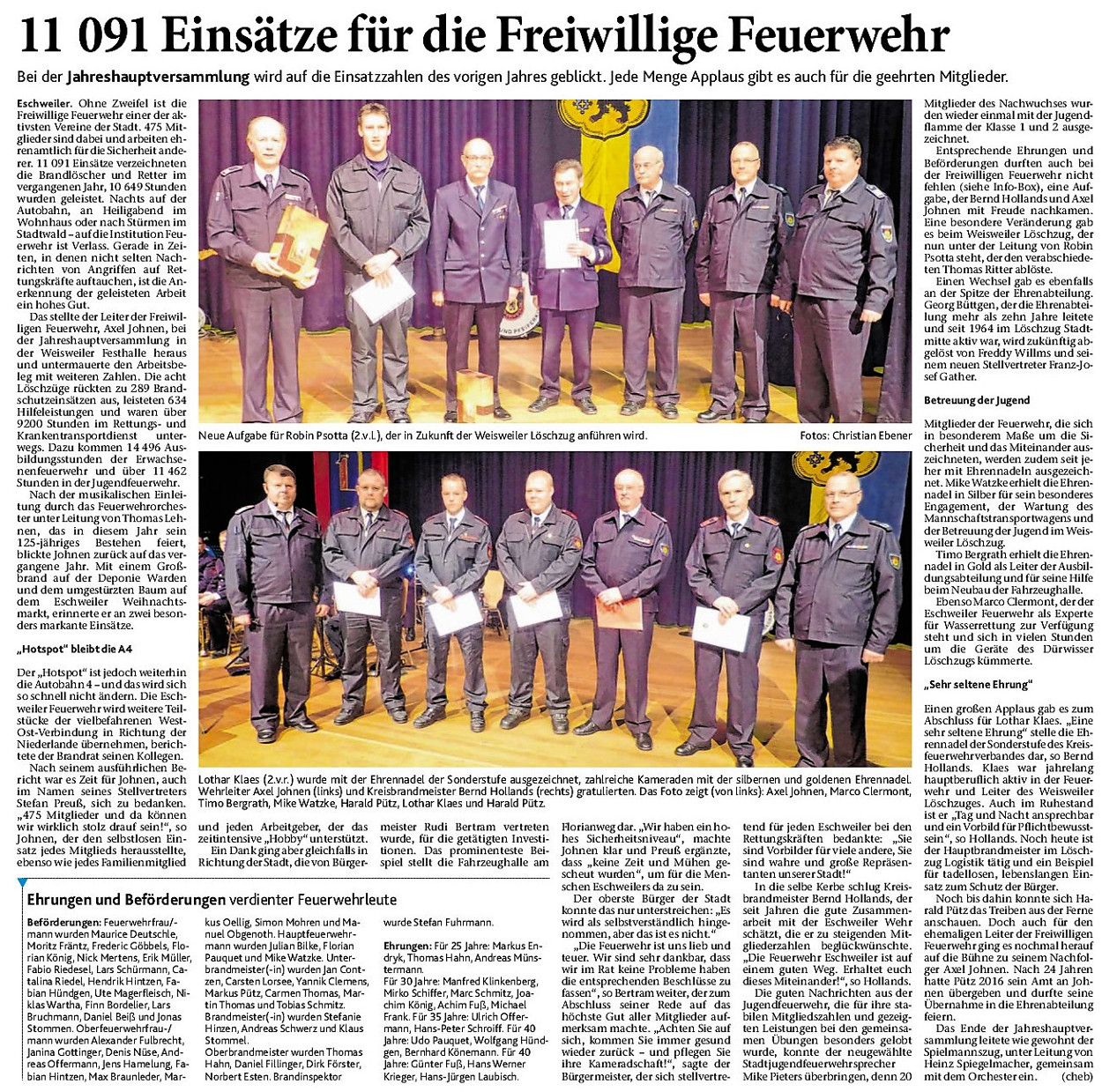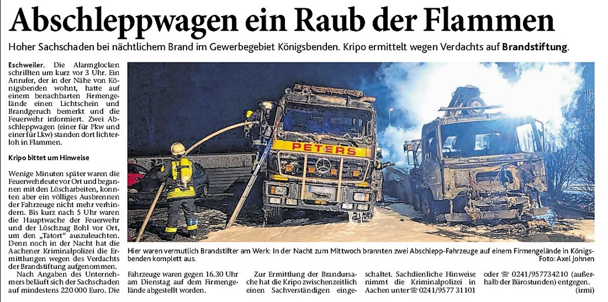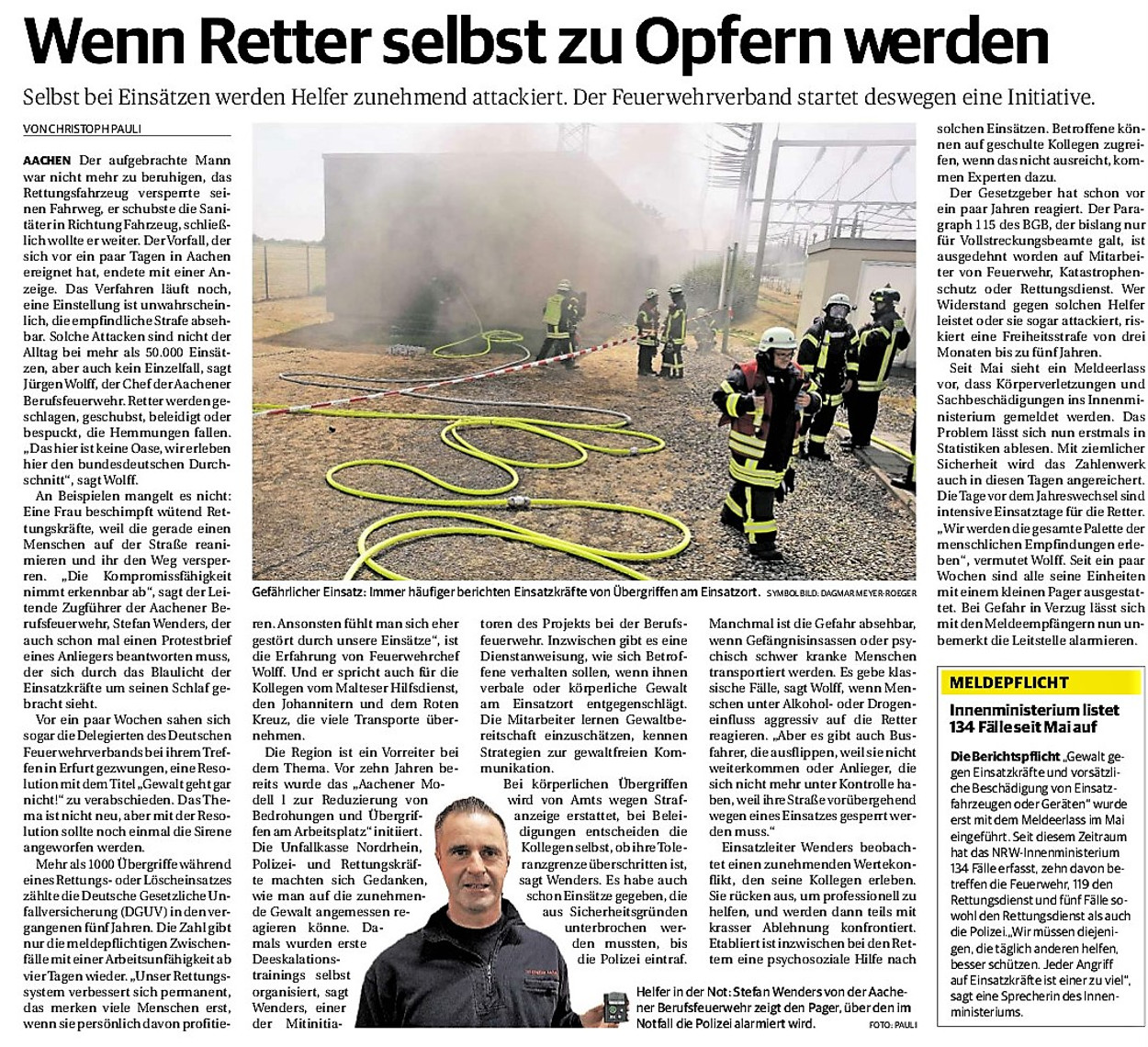 2018 31.12.2018 80-Jährige stirbt bei Brand in Nothberg EN / EZ 31.12.2018 Wenn Retter selbst zu Opfern werden EN / EZ 20.12.2018 Nach Kollision in Lebensgefahr EN / EZ 28.11.2018 Kurz Notiert - Rote Ampel übersehen EN / EZ 10.11.2018 Frontalzusammenstoß in Kinzweiler EN / EZ 08.11.2018 Auch ein Held braucht manchmal Hilfe EN / EZ 08.11.2018 Brandmeisterbewerbung mit Drehleiterübung EN / EZ 01.11.2018 Brandstiftung? Drei Autos brennen in Stich EN / EZ 24.10.2018 Hausfassade in Brand geraten EN / EZ 19.10.2018 Jahrestreffen der Ehrenabteilungen des Kreises EN / EZ 15.10.2018 20 jähriger fährt auf Motorradgruppe EN / EZ 10.10.2018 Abschluss Grundlehrgang Modul EN / EZ 04.10.2018 Jugendfeuerwehr - Gemeinsam im Ernstfall EN / EZ 01.10.2018 Die zwölfte Auflage des B 1 - Lehrgangs EN / EZ 29.09.2018 Verwaltung umstrukturiert - Amt 37 EN / EZ 27.09.2018 Tonnenweise Ecstasy-Chemiemüll? EN / EZ 19.09.2018 Von Lagerhalle bleibt nur Gerippe übrig EN / EZ 04.09.2018 Löschzug 21 - Tag der Feuerwehr EN / EZ 30.08.2018 Kreisbrandmeister Bernd Hollands EN / EZ 28.08.2018 Rauchwolke erreicht Eschweiler EN / EZ 24.08.2018 Feuer zu löschen, ist inzwischen Ausnahme EN / EZ 22.08.2018 Zwei neue Einsatzfahrzeuge EN / EZ 10.08.2018 Und plötzlich bricht die Fassade weg EN / EZ 26.07.2018 Zwischen Vorsatz und Fahrlässigkeit EN / EZ 25.07.2018 Hitzewelle und Waldbrandgefahr EN / EZ 24.07.2018 Wehrleute bei einem dreitägigen Seminar EN / EZ 21.07.2018 Nächtlicher Schwimmer löst Großalarm aus EN / EZ 11.07.2018 Ein Unfall, der sich gewaschen hat EN / EZ 09.07.2018 Ein Flammenmeer im dritten Stock EN / EZ 06.07.2018 86 Liter Säure laufen aus EN / EZ 04.07.2018 Es freut uns EN / EZ 27.06.2018 Akute Platznot in den Rettungswachen EN / EZ 26.06.2018 Feuer vernichtet Kranwagen und Trafo EN / EZ 22.06.2018 Die Feuerwehr bekommt ein eigenes Amt EN / EZ 21.06.2018 Zwei schwere Zusammenstöße mit Verletzten EN / EZ 21.06.2018 Triatlon-Training löst Feuerwehreinatz aus EN / EZ 19.06.2018 Leistungsnachweis der Städteregion EN / EZ 05.06.2018 Unfall auf der Aachener Straße EN / EZ 28.05.2018 Garagenbrand in Dürwiß EN / EZ 01.05.2018 Überflutete Straßen und Keller EN / EZ 23.04.2018 Retter proben den Ernstfall EN / EZ 23.04.2018 Auffahrunfall zweier Busse und Hallenbrand EN / EZ 13.04.2018 Einladung - 6. Rettungsübung am Florianweg EN / EZ 10.04.2018 Der 13. Interkommunale B1-Lehrgang startet EN / EZ 09.04.2018 Dicke Luft in der Indestadt EN / EZ 03.04.2018 Lagerhalle an der Grachtstraße Raub der Flammen EN / EZ 23.03.2018 Verpuffung im Elektrowerk Weisweiler EN / EZ 23.03.2018 Jahreshauptversammlung der Feuerwehr Eschweiler EN / EZ 16.03.2018 Jahreshauptversammlung der Jugendfeuerwehr EN / EZ 10.03.2018 Hohe Einsatzzahlen des Rettungsdienstes EN / EZ 24.02.2018 Kamin steht in Flammen EN / EZ 20.02.2018 Kurz Notiert - Feuer in Hastenrath EN / EZ 14.02.2018 Reizgasangriff am Markt EN / EZ 12.02.2018 Prinzenempfang mit Überraschungen EN / EZ 12.02.2018 Retter der Feuerwehr im Dauereinsatz EN / EZ 10.02.2018 Vor allem am Markt alle Hände voll zu tun EN / EZ 09.02.2018 Nicht alle feiern friedlich EN / EZ 06.02.2018 Kurz Notiert - Zwei Verletzte auf der A 4 EN / EZ 03.02.2018 Kurz Notiert - Essen angebrannt EN / EZ 27.01.2018 Kurz Notiert - Bei Unfall schwer verletzt EN / EZ 24.01.2018 Liebes Tagebuch - Gerätehaus Dürwiß EN / EZ 19.01.2018 Sturm hinterlässt Sach- und Dachschaden EN / EZ 18.01.2018 Abschleppwagen ein Raub der Flammen EN / EZ 12.01.2018 Nach einem Jahr Rauchmelderpflicht EN / EZ 05.01.2018 Entwarnung erst nach 16 harten Stunden EN / EZ 04.01.2018 Tief "Burglind" EN / EZ 02.01.2018 Die Feuerwehr erlebt einen ruhigen Jahreswechsel EN / EZ