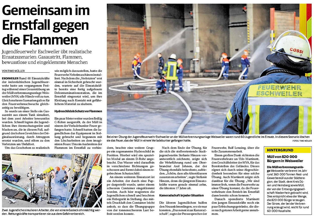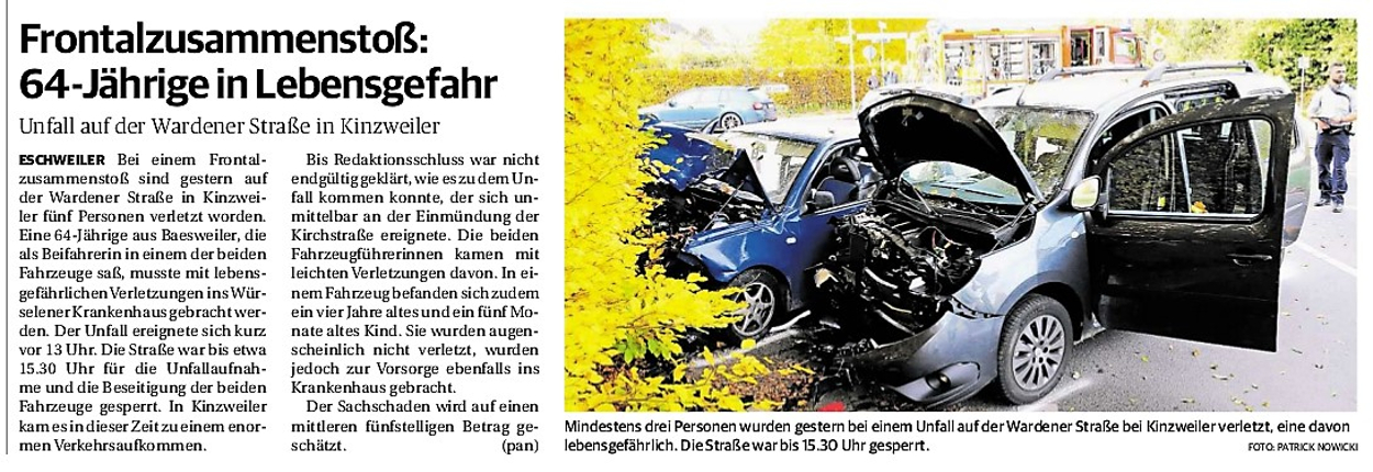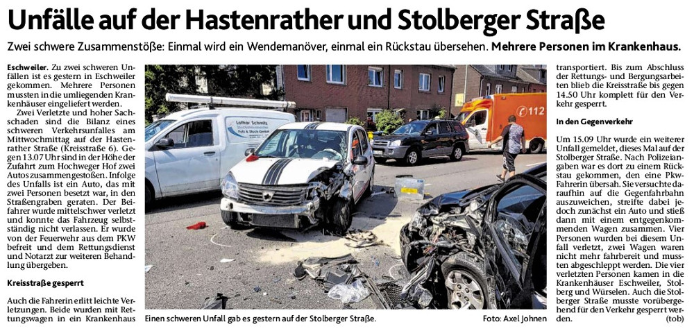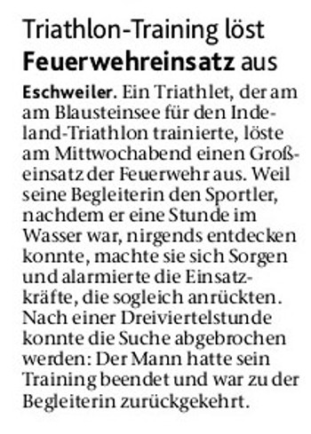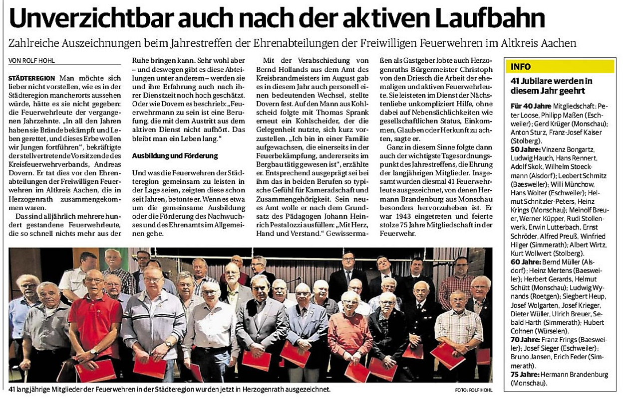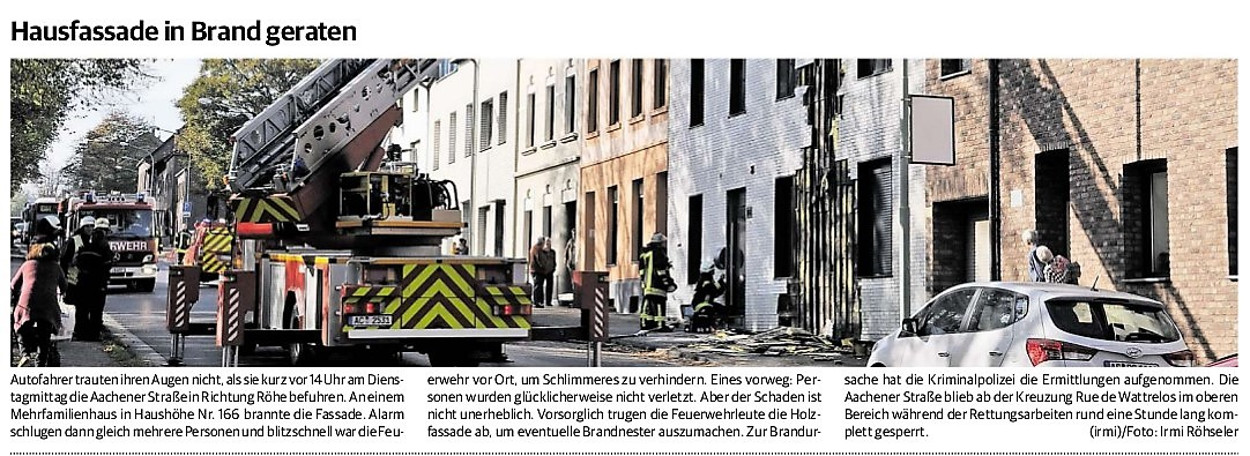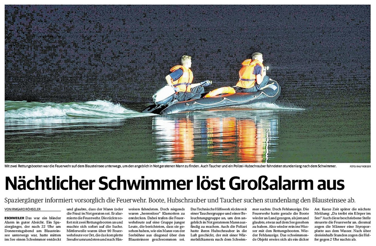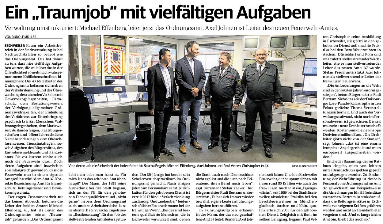 2018 31.12.2018 80-Jährige stirbt bei Brand in Nothberg EN / EZ 31.12.2018 Wenn Retter selbst zu Opfern werden EN / EZ 20.12.2018 Nach Kollision in Lebensgefahr EN / EZ 28.11.2018 Kurz Notiert - Rote Ampel übersehen EN / EZ 10.11.2018 Frontalzusammenstoß in Kinzweiler EN / EZ 08.11.2018 Auch ein Held braucht manchmal Hilfe EN / EZ 08.11.2018 Brandmeisterbewerbung mit Drehleiterübung EN / EZ 01.11.2018 Brandstiftung? Drei Autos brennen in Stich EN / EZ 24.10.2018 Hausfassade in Brand geraten EN / EZ 19.10.2018 Jahrestreffen der Ehrenabteilungen des Kreises EN / EZ 15.10.2018 20 jähriger fährt auf Motorradgruppe EN / EZ 10.10.2018 Abschluss Grundlehrgang Modul EN / EZ 04.10.2018 Jugendfeuerwehr - Gemeinsam im Ernstfall EN / EZ 01.10.2018 Die zwölfte Auflage des B 1 - Lehrgangs EN / EZ 29.09.2018 Verwaltung umstrukturiert - Amt 37 EN / EZ 27.09.2018 Tonnenweise Ecstasy-Chemiemüll? EN / EZ 19.09.2018 Von Lagerhalle bleibt nur Gerippe übrig EN / EZ 04.09.2018 Löschzug 21 - Tag der Feuerwehr EN / EZ 30.08.2018 Kreisbrandmeister Bernd Hollands EN / EZ 28.08.2018 Rauchwolke erreicht Eschweiler EN / EZ 24.08.2018 Feuer zu löschen, ist inzwischen Ausnahme EN / EZ 22.08.2018 Zwei neue Einsatzfahrzeuge EN / EZ 10.08.2018 Und plötzlich bricht die Fassade weg EN / EZ 26.07.2018 Zwischen Vorsatz und Fahrlässigkeit EN / EZ 25.07.2018 Hitzewelle und Waldbrandgefahr EN / EZ 24.07.2018 Wehrleute bei einem dreitägigen Seminar EN / EZ 21.07.2018 Nächtlicher Schwimmer löst Großalarm aus EN / EZ 11.07.2018 Ein Unfall, der sich gewaschen hat EN / EZ 09.07.2018 Ein Flammenmeer im dritten Stock EN / EZ 06.07.2018 86 Liter Säure laufen aus EN / EZ 04.07.2018 Es freut uns EN / EZ 27.06.2018 Akute Platznot in den Rettungswachen EN / EZ 26.06.2018 Feuer vernichtet Kranwagen und Trafo EN / EZ 22.06.2018 Die Feuerwehr bekommt ein eigenes Amt EN / EZ 21.06.2018 Zwei schwere Zusammenstöße mit Verletzten EN / EZ 21.06.2018 Triatlon-Training löst Feuerwehreinatz aus EN / EZ 19.06.2018 Leistungsnachweis der Städteregion EN / EZ 05.06.2018 Unfall auf der Aachener Straße EN / EZ 28.05.2018 Garagenbrand in Dürwiß EN / EZ 01.05.2018 Überflutete Straßen und Keller EN / EZ 23.04.2018 Retter proben den Ernstfall EN / EZ 23.04.2018 Auffahrunfall zweier Busse und Hallenbrand EN / EZ 13.04.2018 Einladung - 6. Rettungsübung am Florianweg EN / EZ 10.04.2018 Der 13. Interkommunale B1-Lehrgang startet EN / EZ 09.04.2018 Dicke Luft in der Indestadt EN / EZ 03.04.2018 Lagerhalle an der Grachtstraße Raub der Flammen EN / EZ 23.03.2018 Verpuffung im Elektrowerk Weisweiler EN / EZ 23.03.2018 Jahreshauptversammlung der Feuerwehr Eschweiler EN / EZ 16.03.2018 Jahreshauptversammlung der Jugendfeuerwehr EN / EZ 10.03.2018 Hohe Einsatzzahlen des Rettungsdienstes EN / EZ 24.02.2018 Kamin steht in Flammen EN / EZ 20.02.2018 Kurz Notiert - Feuer in Hastenrath EN / EZ 14.02.2018 Reizgasangriff am Markt EN / EZ 12.02.2018 Prinzenempfang mit Überraschungen EN / EZ 12.02.2018 Retter der Feuerwehr im Dauereinsatz EN / EZ 10.02.2018 Vor allem am Markt alle Hände voll zu tun EN / EZ 09.02.2018 Nicht alle feiern friedlich EN / EZ 06.02.2018 Kurz Notiert - Zwei Verletzte auf der A 4 EN / EZ 03.02.2018 Kurz Notiert - Essen angebrannt EN / EZ 27.01.2018 Kurz Notiert - Bei Unfall schwer verletzt EN / EZ 24.01.2018 Liebes Tagebuch - Gerätehaus Dürwiß EN / EZ 19.01.2018 Sturm hinterlässt Sach- und Dachschaden EN / EZ 18.01.2018 Abschleppwagen ein Raub der Flammen EN / EZ 12.01.2018 Nach einem Jahr Rauchmelderpflicht EN / EZ 05.01.2018 Entwarnung erst nach 16 harten Stunden EN / EZ 04.01.2018 Tief "Burglind" EN / EZ 02.01.2018 Die Feuerwehr erlebt einen ruhigen Jahreswechsel EN / EZ