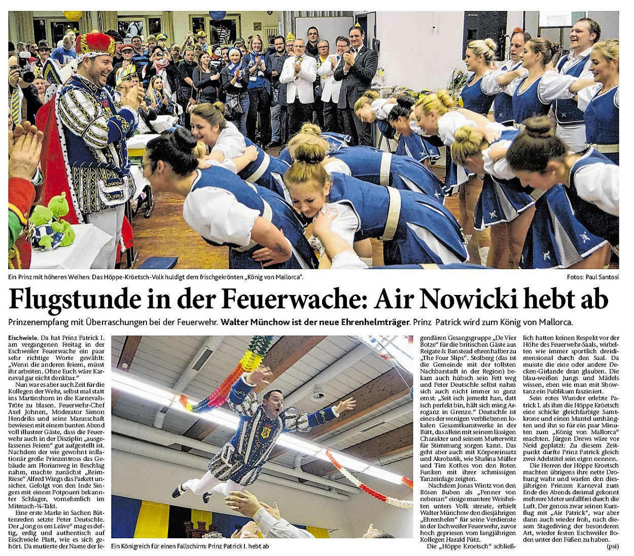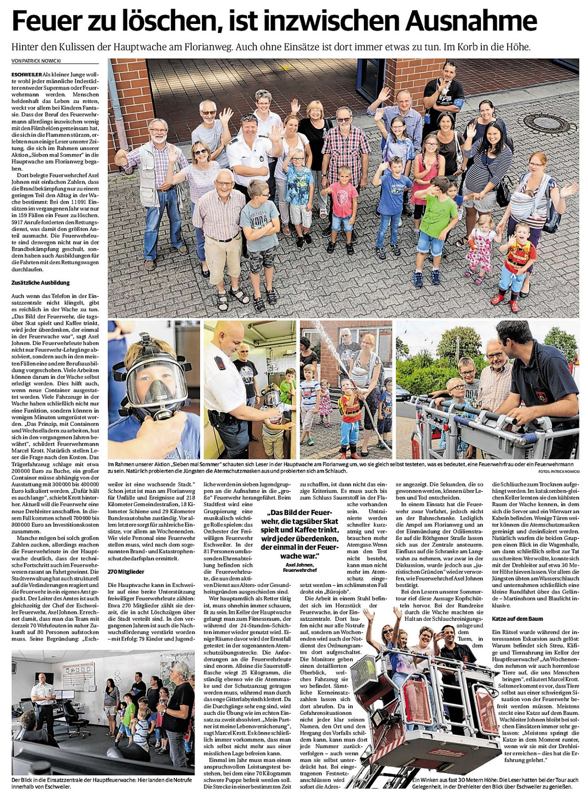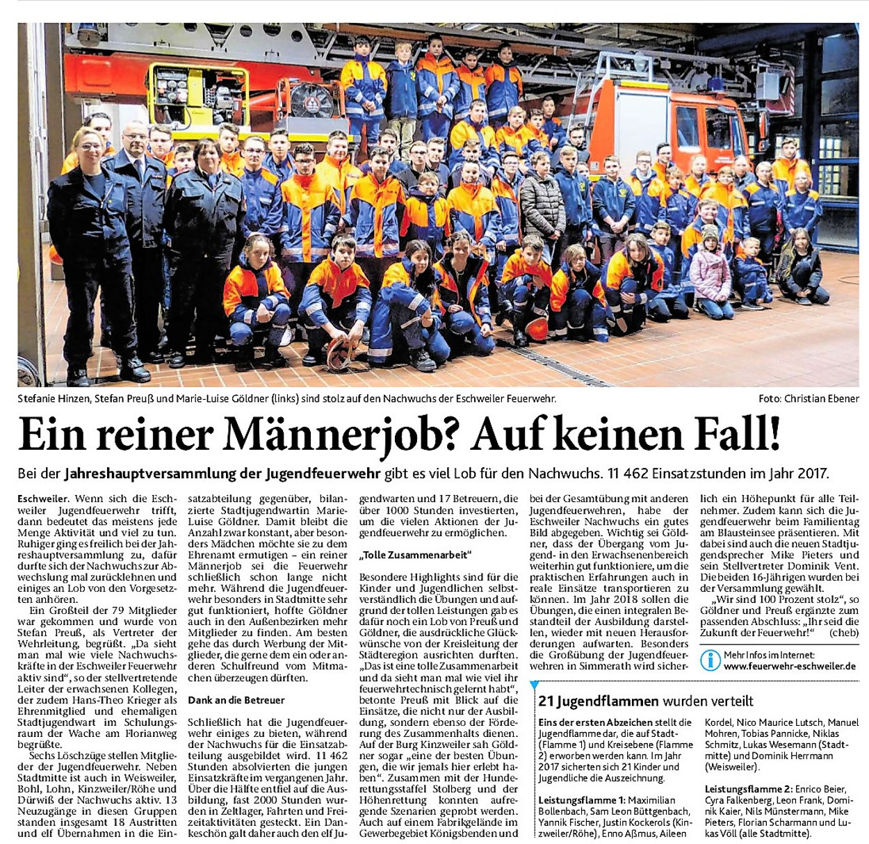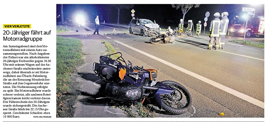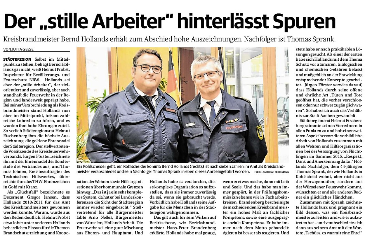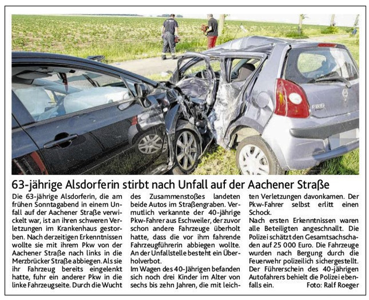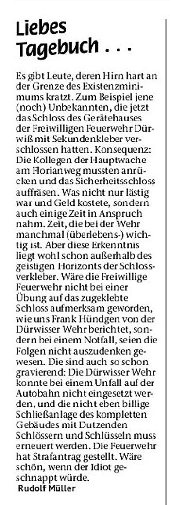 2018 31.12.2018 80-Jährige stirbt bei Brand in Nothberg EN / EZ 31.12.2018 Wenn Retter selbst zu Opfern werden EN / EZ 20.12.2018 Nach Kollision in Lebensgefahr EN / EZ 28.11.2018 Kurz Notiert - Rote Ampel übersehen EN / EZ 10.11.2018 Frontalzusammenstoß in Kinzweiler EN / EZ 08.11.2018 Auch ein Held braucht manchmal Hilfe EN / EZ 08.11.2018 Brandmeisterbewerbung mit Drehleiterübung EN / EZ 01.11.2018 Brandstiftung? Drei Autos brennen in Stich EN / EZ 24.10.2018 Hausfassade in Brand geraten EN / EZ 19.10.2018 Jahrestreffen der Ehrenabteilungen des Kreises EN / EZ 15.10.2018 20 jähriger fährt auf Motorradgruppe EN / EZ 10.10.2018 Abschluss Grundlehrgang Modul EN / EZ 04.10.2018 Jugendfeuerwehr - Gemeinsam im Ernstfall EN / EZ 01.10.2018 Die zwölfte Auflage des B 1 - Lehrgangs EN / EZ 29.09.2018 Verwaltung umstrukturiert - Amt 37 EN / EZ 27.09.2018 Tonnenweise Ecstasy-Chemiemüll? EN / EZ 19.09.2018 Von Lagerhalle bleibt nur Gerippe übrig EN / EZ 04.09.2018 Löschzug 21 - Tag der Feuerwehr EN / EZ 30.08.2018 Kreisbrandmeister Bernd Hollands EN / EZ 28.08.2018 Rauchwolke erreicht Eschweiler EN / EZ 24.08.2018 Feuer zu löschen, ist inzwischen Ausnahme EN / EZ 22.08.2018 Zwei neue Einsatzfahrzeuge EN / EZ 10.08.2018 Und plötzlich bricht die Fassade weg EN / EZ 26.07.2018 Zwischen Vorsatz und Fahrlässigkeit EN / EZ 25.07.2018 Hitzewelle und Waldbrandgefahr EN / EZ 24.07.2018 Wehrleute bei einem dreitägigen Seminar EN / EZ 21.07.2018 Nächtlicher Schwimmer löst Großalarm aus EN / EZ 11.07.2018 Ein Unfall, der sich gewaschen hat EN / EZ 09.07.2018 Ein Flammenmeer im dritten Stock EN / EZ 06.07.2018 86 Liter Säure laufen aus EN / EZ 04.07.2018 Es freut uns EN / EZ 27.06.2018 Akute Platznot in den Rettungswachen EN / EZ 26.06.2018 Feuer vernichtet Kranwagen und Trafo EN / EZ 22.06.2018 Die Feuerwehr bekommt ein eigenes Amt EN / EZ 21.06.2018 Zwei schwere Zusammenstöße mit Verletzten EN / EZ 21.06.2018 Triatlon-Training löst Feuerwehreinatz aus EN / EZ 19.06.2018 Leistungsnachweis der Städteregion EN / EZ 05.06.2018 Unfall auf der Aachener Straße EN / EZ 28.05.2018 Garagenbrand in Dürwiß EN / EZ 01.05.2018 Überflutete Straßen und Keller EN / EZ 23.04.2018 Retter proben den Ernstfall EN / EZ 23.04.2018 Auffahrunfall zweier Busse und Hallenbrand EN / EZ 13.04.2018 Einladung - 6. Rettungsübung am Florianweg EN / EZ 10.04.2018 Der 13. Interkommunale B1-Lehrgang startet EN / EZ 09.04.2018 Dicke Luft in der Indestadt EN / EZ 03.04.2018 Lagerhalle an der Grachtstraße Raub der Flammen EN / EZ 23.03.2018 Verpuffung im Elektrowerk Weisweiler EN / EZ 23.03.2018 Jahreshauptversammlung der Feuerwehr Eschweiler EN / EZ 16.03.2018 Jahreshauptversammlung der Jugendfeuerwehr EN / EZ 10.03.2018 Hohe Einsatzzahlen des Rettungsdienstes EN / EZ 24.02.2018 Kamin steht in Flammen EN / EZ 20.02.2018 Kurz Notiert - Feuer in Hastenrath EN / EZ 14.02.2018 Reizgasangriff am Markt EN / EZ 12.02.2018 Prinzenempfang mit Überraschungen EN / EZ 12.02.2018 Retter der Feuerwehr im Dauereinsatz EN / EZ 10.02.2018 Vor allem am Markt alle Hände voll zu tun EN / EZ 09.02.2018 Nicht alle feiern friedlich EN / EZ 06.02.2018 Kurz Notiert - Zwei Verletzte auf der A 4 EN / EZ 03.02.2018 Kurz Notiert - Essen angebrannt EN / EZ 27.01.2018 Kurz Notiert - Bei Unfall schwer verletzt EN / EZ 24.01.2018 Liebes Tagebuch - Gerätehaus Dürwiß EN / EZ 19.01.2018 Sturm hinterlässt Sach- und Dachschaden EN / EZ 18.01.2018 Abschleppwagen ein Raub der Flammen EN / EZ 12.01.2018 Nach einem Jahr Rauchmelderpflicht EN / EZ 05.01.2018 Entwarnung erst nach 16 harten Stunden EN / EZ 04.01.2018 Tief "Burglind" EN / EZ 02.01.2018 Die Feuerwehr erlebt einen ruhigen Jahreswechsel EN / EZ