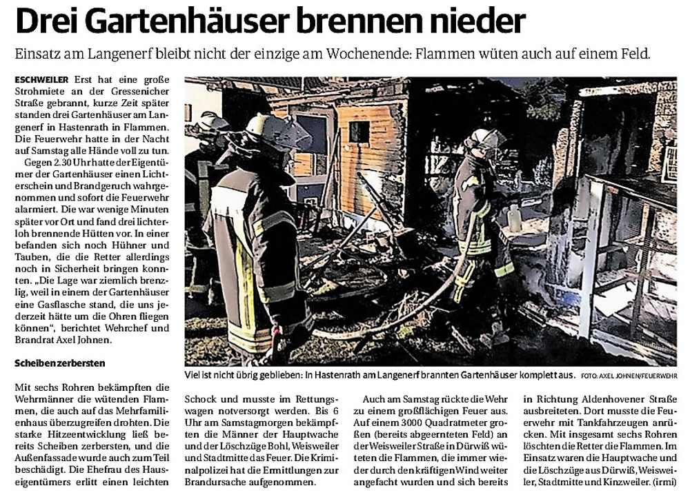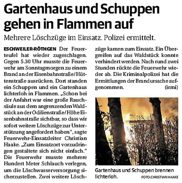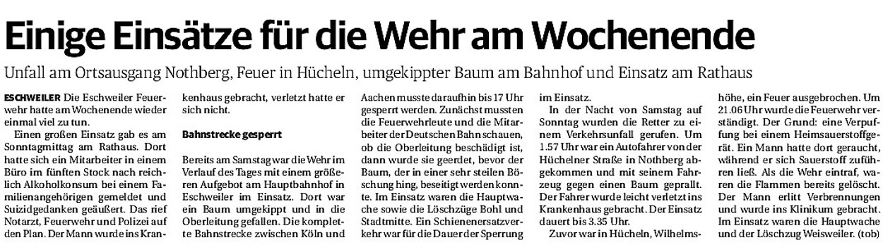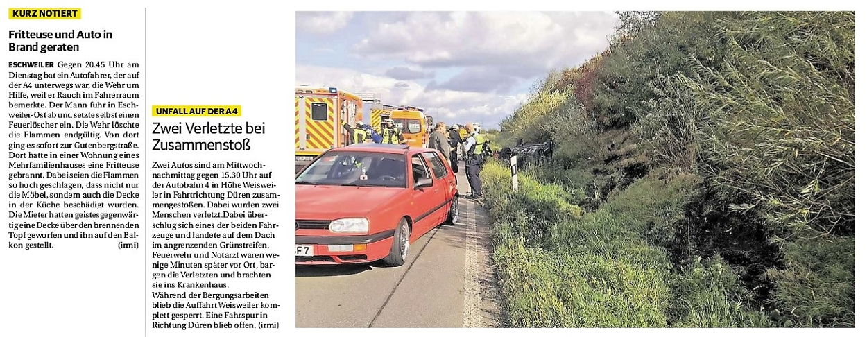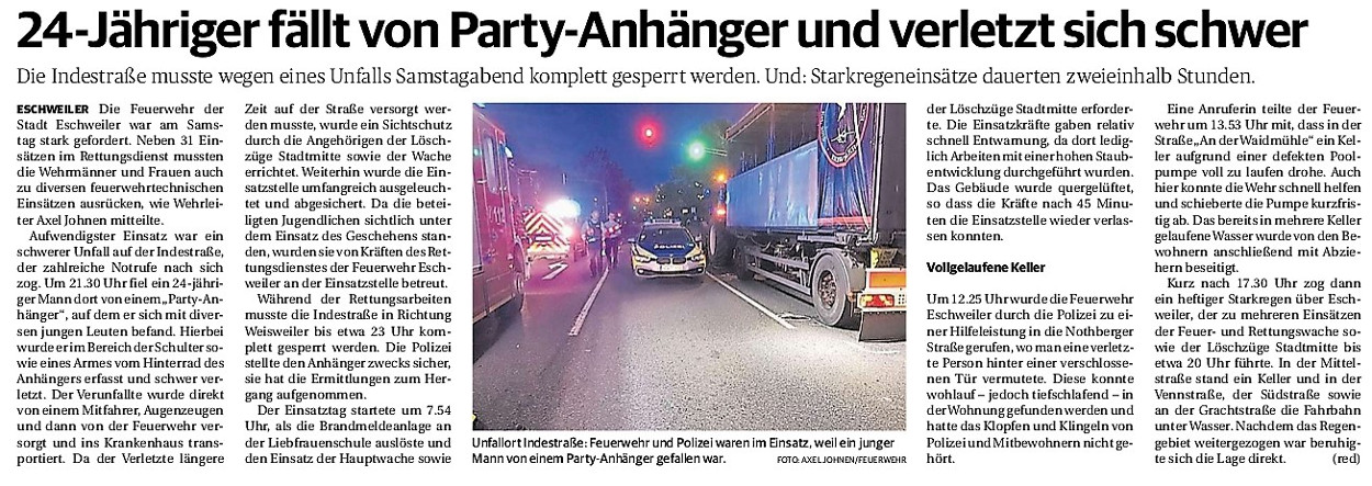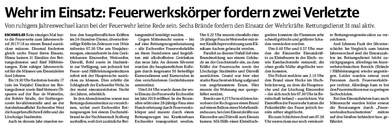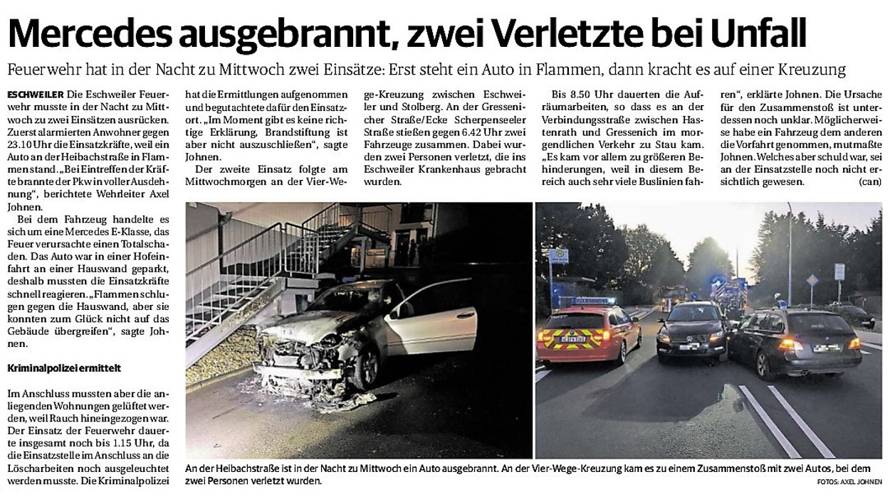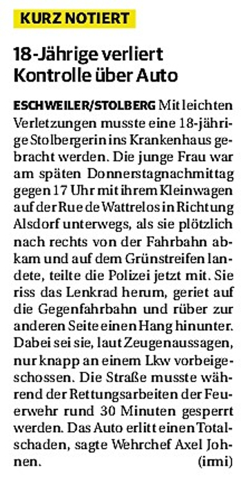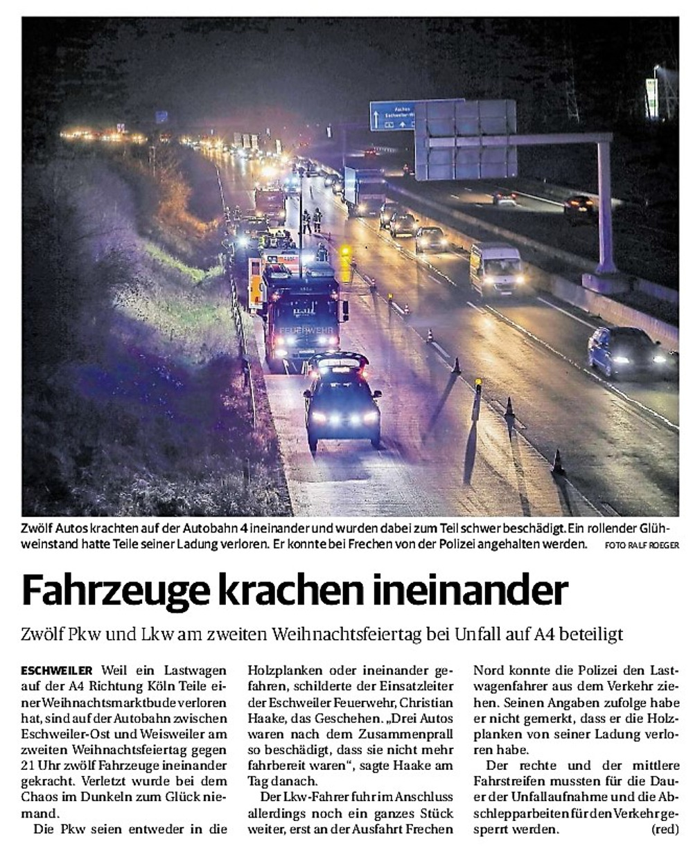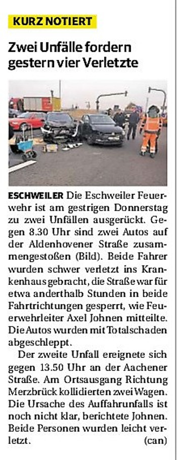 2019 30.12.2019 In Röhe brennt eine Sauna im Anbau aus EN / EZ 28.12.2019 A4 - Fahrzeuge krachen ineinander EN / EZ 16.12.2019 Kurz Notiert - Zwei wetterbedingte Einsätze EN / EZ 11.12.2019 Schwerer Unfall auf Rue de Wattrelos EN / EZ 22.11.2019 Kurz Notiert - Zwei Unfälle fordern vier Verletzte EN / EZ 20.11.2019 A4 dicht: LKW-Fahrer mit 2,3 Promille EN / EZ 10.11.2019 Delegiertentag des Kreisfeuerwehrverbands SuperSonntag 29.10.2019 Kurz Notiert - Angebranntes Essen EN / EZ 23.10.2019 18 Feuerwehrleute bestanden Grundausbildung EN / EZ 14.10.2019 Jugendfeuerwehr - Spiel ohne Grenzen EN / EZ 09.10.2019 Kreisjugendfeuerwehrtag in Alsdorf Filmpost 09.10.2019 Vier Verletzte auf Rue de Wattrelos EN / EZ 07.10.2019 Kurz Notiert - Küchenbrand EN / EZ 03.10.2019 Kurz Notiert - und - Unfall Auf Der A 4 EN / EZ 02.10.2019 Interkommunaler Brandmeisterlehrgang Filmpost 30.09.2019 Kurz Notiert - Baum drohte zu stürzen EN / EZ 30.09.2019 Jugendfeuerwehr trainiert in Lagerhalle EN / EZ 26.09.2019 Kurz Notiert - Trockene Löschteiche EN / EZ 23.09.2019 18 Jährige verliert Kontrolle über Auto EN / EZ 23.09.2019 Erneut Unfall im Blausteinsee EN / EZ 23.09.2019 Spektrakuläre Unfallszenarien: Schockraumtraining EN / EZ 20.09.2019 Der Einsatz, die Obduktion, die Fragen EN / EZ 19.09.2019 Mercedes ausgebrannt, zwei Verletzte bei Unfall EN / EZ 12.09.2019 Kurz Notiert - Gasalarm und Pkw-Brand EN / EZ 30.08.2019 Polizei ermittelt wegen Brandstiftung EN / EZ 28.08.2019 Mit Blaulicht aufs Fest EN / EZ 23.08.2019 Dachstuhl brennt in der Nacht komplett durch EN / EZ 21.08.2019 Das Feuerwehrorchester auf dem Marktplatz Filmpost 15.08.2019 Weit mehr als "nur" Brandschutz EN / EZ 10.08.2019 Training - Rettung von Großtieren EN / EZ 09.08.2019 Kurz Notiert - Feuerwehr holt Kind aus Aufzug EN / EZ 08.08.2019 BAB-A4 - PKW von LKW mitgeschleift EN / EZ 01.08.2019 Freiwillige Feuerwehr bewässert Jungbäume EN / EZ 31.07.2019 Gartenhaus und Schuppen in Flammen EN / EZ 30.07.2019 Rathausbrand EN / EZ 27.07.2019 Es freut uns - Feuerwehr unterstützt Grünflächenamt EN / EZ 22.07.2019 Unfall mit Party-Anhänger und Starkregeneinsätze EN / EZ 16.07.2019 Jugendfeuerwehren legen sich ins Zeug EN / EZ 09.07.2019 Drei Gartenhäuser brennen nieder EN / EZ 06.07.2019 Von Ballenpresse ausgelöster Feldbrand EN / EZ 05.07.2019 Ein nagelneues Löschfahrzeug "für umsonst" EN / EZ 03.07.2019 Rue de Wattrelos - LKW-Anhänger kippt um EN / EZ 28.06.2019 Kurz Notiert - "Spiel ohne Grenzen" ist abgesagt EN / EZ 26.06.2019 Kat-Schutz - Zehn neue Fahrzeuge übergeben EN / EZ 24.06.2019 "Spiel ohne Grenzen" bei der Jugendfeuerwehr EN / EZ 19.06.2019 Der Leistungsnachweis in Konzen / Imgenbroich EN / EZ 01.06.2019 Info - Rettungskräfte angegriffen EN / EZ 28.05.2019 Kurz Notiert - Brand zerstört Schuppen EN / EZ 24.05.2019 Jugendfeuerwehr - Ein Tag ohne Einsatzübung EN / EZ 16.05.2019 Gartenhaus brennt EN / EZ 15.05.2019 Ein Schwerverletzter, Haus unbewohnbar EN / EZ 04.05.2019 Internationaler Tag der Feuerwehrleute - 2 EN / EZ 04.05.2019 Internationaler Tag der Feuerwehrleute - 1 EN / EZ 29.04.2019 Wenn das E-Auto in Flammen steht EN / EZ 27.04.2019 Neuer Rettungswagen für Feuerwehr EN / EZ 20.04.2019 Brennender Durchlauferhitzer EN / EZ 13.04.2019 Kurz Notiert - Strohballen brennen EN / EZ 11.04.2019 Der 14. interkommunale Brandmeisterlehrgang EN / EZ 04.04.2019 Kurz Notiert - Ölspur EN / EZ 01.04.2019 Die Jahreshauptversammlung der Feuerwehr EN / EZ 28.03.2019 Wohnung in Mehrfamilienhaus brennt aus EN / EZ 25.03.2019 80 Mädchen und Jungen im Einsatz EN / EZ 13.03.2019 Großeinsatz der Wehr EN / EZ 12.03.2019 Einsätze im Takt von 5 Minuten EN / EZ 11.03.2019 Trauerweide umgestürzt EN / EZ 08.03.2019 Kurz Notiert - Drei Einsätze binnen kurzer Zeit EN / EZ 06.03.2019 Schlussbilanz zu Rosenmontag EN / EZ 05.03.2019 Rosenmontag - Kurz notiert EN / EZ 04.03.2019 Prinzenempfang am Florianweg EN / EZ 02.03.2019 Es freut uns - Es ärgert uns EN / EZ 01.03.2019 Donnerstag - 14-Jährige liefert traurigen Ausrutscher EN / EZ 27.02.2019 Städteregion - Mehr Jugendfeuerwehrmitglieder EN / EZ 18.02.2019 Transporter stürzt auf der A 4 um EN / EZ 15.02.2019 Eine angesägte Gasleitung EN / EZ 06.02.2019 Kehrmaschine zieht Ölspur durch die Stadt EN / EZ 02.02.2019 Zufahrt zur A 544 nach Unfall gesperrt EN / EZ 30.01.2019 Auch Helfer brauchen manchmal Hilfe EN / EZ 29.01.2019 Liebes Tagebuch - In Sachen Bahnschranke EN / EZ 28.01.2019 Einige Einsätze für die Wehr EN / EZ 17.01.2019 Es Freut Uns - Feuerwehr reagierte sofort EN / EZ 02.01.2019 Von ruhigem Jahreswechsel keine Rede EN / EZ