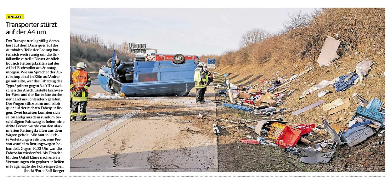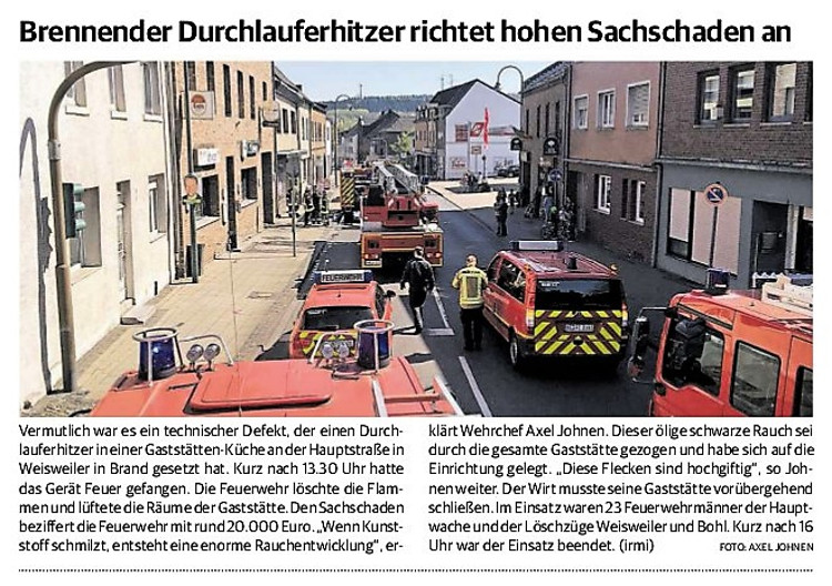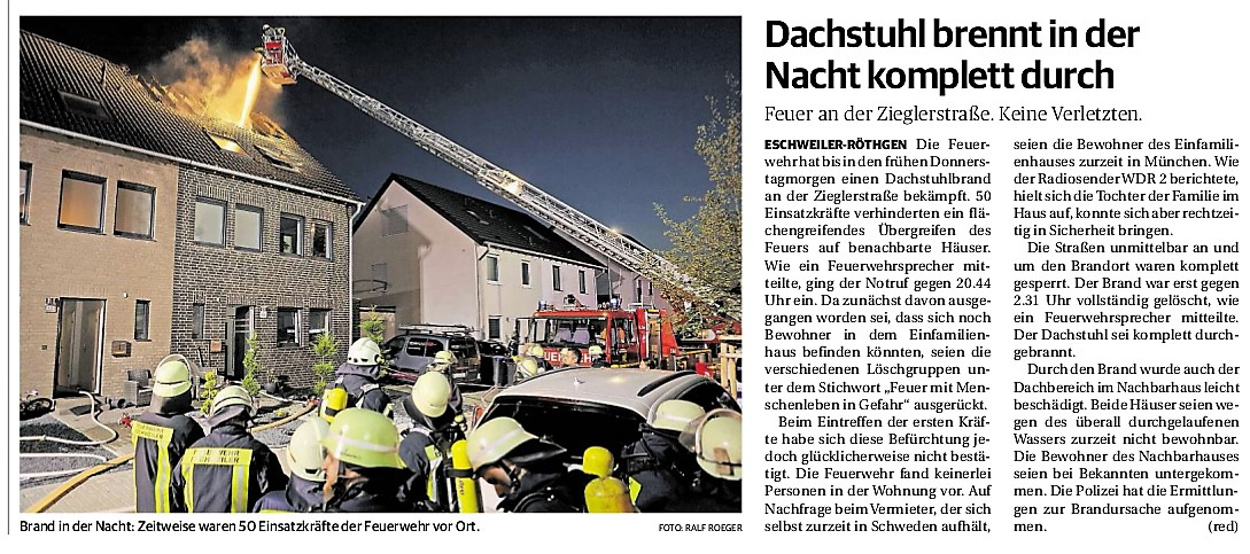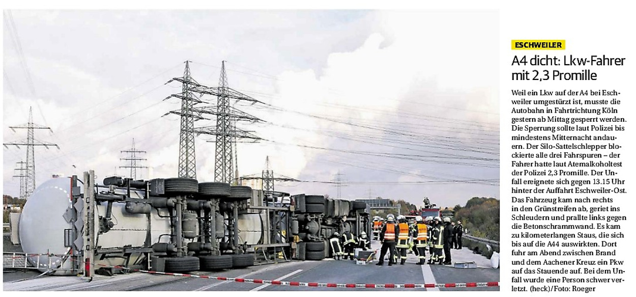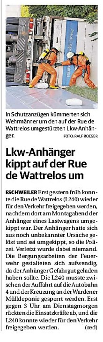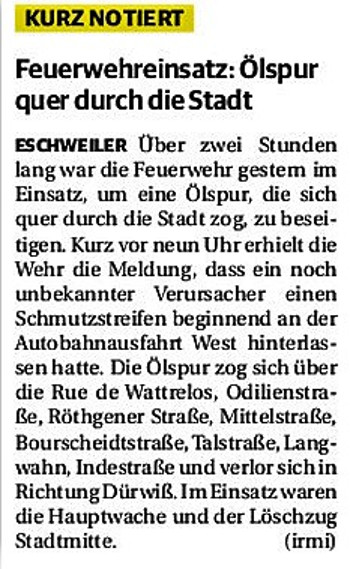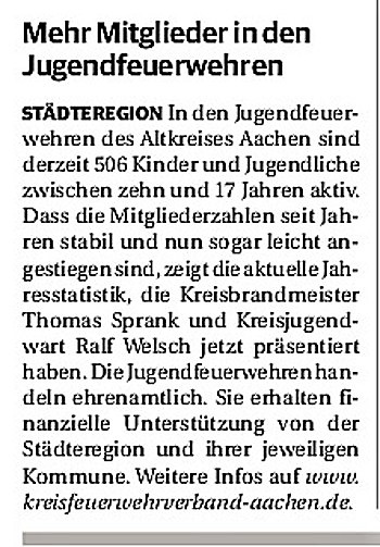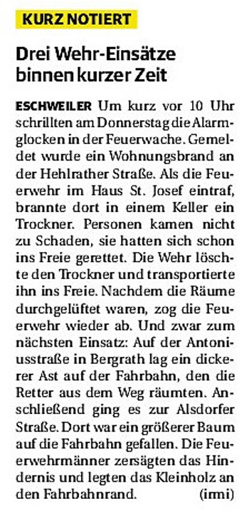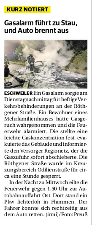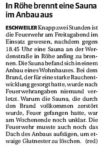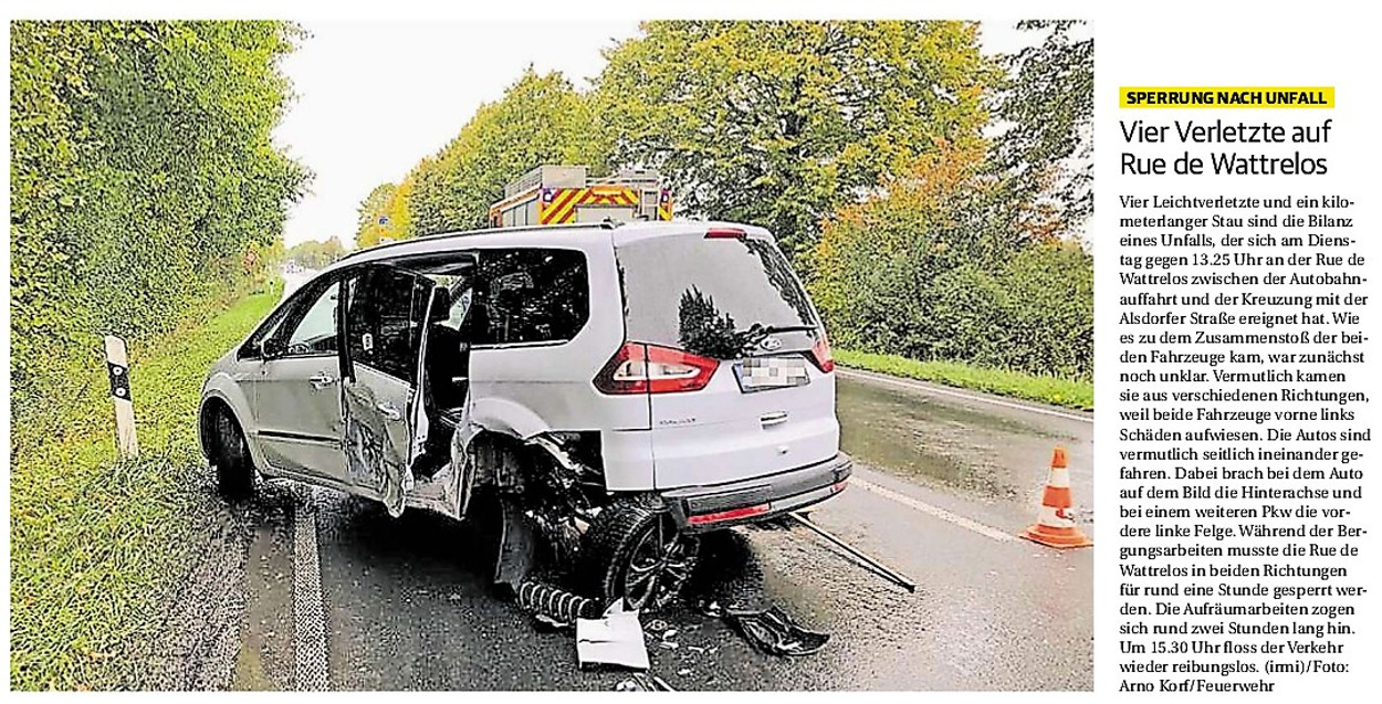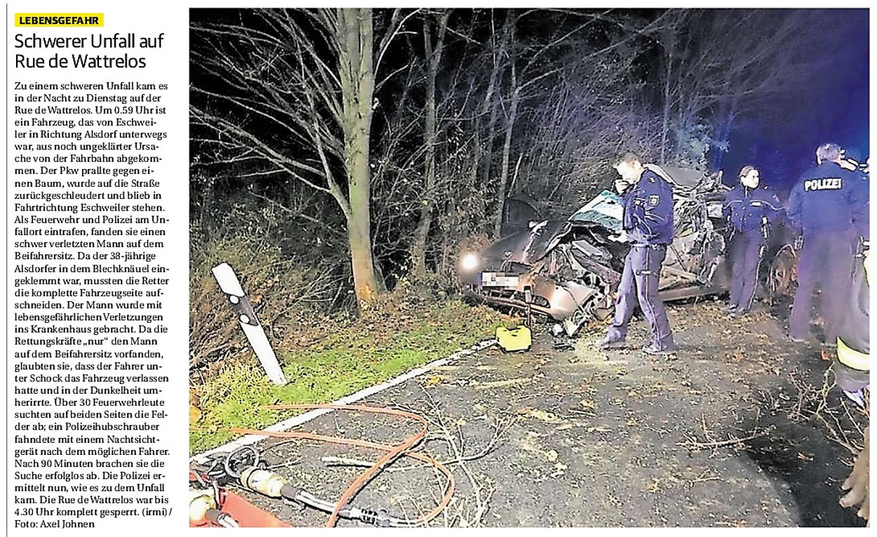 2019 30.12.2019 In Röhe brennt eine Sauna im Anbau aus EN / EZ 28.12.2019 A4 - Fahrzeuge krachen ineinander EN / EZ 16.12.2019 Kurz Notiert - Zwei wetterbedingte Einsätze EN / EZ 11.12.2019 Schwerer Unfall auf Rue de Wattrelos EN / EZ 22.11.2019 Kurz Notiert - Zwei Unfälle fordern vier Verletzte EN / EZ 20.11.2019 A4 dicht: LKW-Fahrer mit 2,3 Promille EN / EZ 10.11.2019 Delegiertentag des Kreisfeuerwehrverbands SuperSonntag 29.10.2019 Kurz Notiert - Angebranntes Essen EN / EZ 23.10.2019 18 Feuerwehrleute bestanden Grundausbildung EN / EZ 14.10.2019 Jugendfeuerwehr - Spiel ohne Grenzen EN / EZ 09.10.2019 Kreisjugendfeuerwehrtag in Alsdorf Filmpost 09.10.2019 Vier Verletzte auf Rue de Wattrelos EN / EZ 07.10.2019 Kurz Notiert - Küchenbrand EN / EZ 03.10.2019 Kurz Notiert - und - Unfall Auf Der A 4 EN / EZ 02.10.2019 Interkommunaler Brandmeisterlehrgang Filmpost 30.09.2019 Kurz Notiert - Baum drohte zu stürzen EN / EZ 30.09.2019 Jugendfeuerwehr trainiert in Lagerhalle EN / EZ 26.09.2019 Kurz Notiert - Trockene Löschteiche EN / EZ 23.09.2019 18 Jährige verliert Kontrolle über Auto EN / EZ 23.09.2019 Erneut Unfall im Blausteinsee EN / EZ 23.09.2019 Spektrakuläre Unfallszenarien: Schockraumtraining EN / EZ 20.09.2019 Der Einsatz, die Obduktion, die Fragen EN / EZ 19.09.2019 Mercedes ausgebrannt, zwei Verletzte bei Unfall EN / EZ 12.09.2019 Kurz Notiert - Gasalarm und Pkw-Brand EN / EZ 30.08.2019 Polizei ermittelt wegen Brandstiftung EN / EZ 28.08.2019 Mit Blaulicht aufs Fest EN / EZ 23.08.2019 Dachstuhl brennt in der Nacht komplett durch EN / EZ 21.08.2019 Das Feuerwehrorchester auf dem Marktplatz Filmpost 15.08.2019 Weit mehr als "nur" Brandschutz EN / EZ 10.08.2019 Training - Rettung von Großtieren EN / EZ 09.08.2019 Kurz Notiert - Feuerwehr holt Kind aus Aufzug EN / EZ 08.08.2019 BAB-A4 - PKW von LKW mitgeschleift EN / EZ 01.08.2019 Freiwillige Feuerwehr bewässert Jungbäume EN / EZ 31.07.2019 Gartenhaus und Schuppen in Flammen EN / EZ 30.07.2019 Rathausbrand EN / EZ 27.07.2019 Es freut uns - Feuerwehr unterstützt Grünflächenamt EN / EZ 22.07.2019 Unfall mit Party-Anhänger und Starkregeneinsätze EN / EZ 16.07.2019 Jugendfeuerwehren legen sich ins Zeug EN / EZ 09.07.2019 Drei Gartenhäuser brennen nieder EN / EZ 06.07.2019 Von Ballenpresse ausgelöster Feldbrand EN / EZ 05.07.2019 Ein nagelneues Löschfahrzeug "für umsonst" EN / EZ 03.07.2019 Rue de Wattrelos - LKW-Anhänger kippt um EN / EZ 28.06.2019 Kurz Notiert - "Spiel ohne Grenzen" ist abgesagt EN / EZ 26.06.2019 Kat-Schutz - Zehn neue Fahrzeuge übergeben EN / EZ 24.06.2019 "Spiel ohne Grenzen" bei der Jugendfeuerwehr EN / EZ 19.06.2019 Der Leistungsnachweis in Konzen / Imgenbroich EN / EZ 01.06.2019 Info - Rettungskräfte angegriffen EN / EZ 28.05.2019 Kurz Notiert - Brand zerstört Schuppen EN / EZ 24.05.2019 Jugendfeuerwehr - Ein Tag ohne Einsatzübung EN / EZ 16.05.2019 Gartenhaus brennt EN / EZ 15.05.2019 Ein Schwerverletzter, Haus unbewohnbar EN / EZ 04.05.2019 Internationaler Tag der Feuerwehrleute - 2 EN / EZ 04.05.2019 Internationaler Tag der Feuerwehrleute - 1 EN / EZ 29.04.2019 Wenn das E-Auto in Flammen steht EN / EZ 27.04.2019 Neuer Rettungswagen für Feuerwehr EN / EZ 20.04.2019 Brennender Durchlauferhitzer EN / EZ 13.04.2019 Kurz Notiert - Strohballen brennen EN / EZ 11.04.2019 Der 14. interkommunale Brandmeisterlehrgang EN / EZ 04.04.2019 Kurz Notiert - Ölspur EN / EZ 01.04.2019 Die Jahreshauptversammlung der Feuerwehr EN / EZ 28.03.2019 Wohnung in Mehrfamilienhaus brennt aus EN / EZ 25.03.2019 80 Mädchen und Jungen im Einsatz EN / EZ 13.03.2019 Großeinsatz der Wehr EN / EZ 12.03.2019 Einsätze im Takt von 5 Minuten EN / EZ 11.03.2019 Trauerweide umgestürzt EN / EZ 08.03.2019 Kurz Notiert - Drei Einsätze binnen kurzer Zeit EN / EZ 06.03.2019 Schlussbilanz zu Rosenmontag EN / EZ 05.03.2019 Rosenmontag - Kurz notiert EN / EZ 04.03.2019 Prinzenempfang am Florianweg EN / EZ 02.03.2019 Es freut uns - Es ärgert uns EN / EZ 01.03.2019 Donnerstag - 14-Jährige liefert traurigen Ausrutscher EN / EZ 27.02.2019 Städteregion - Mehr Jugendfeuerwehrmitglieder EN / EZ 18.02.2019 Transporter stürzt auf der A 4 um EN / EZ 15.02.2019 Eine angesägte Gasleitung EN / EZ 06.02.2019 Kehrmaschine zieht Ölspur durch die Stadt EN / EZ 02.02.2019 Zufahrt zur A 544 nach Unfall gesperrt EN / EZ 30.01.2019 Auch Helfer brauchen manchmal Hilfe EN / EZ 29.01.2019 Liebes Tagebuch - In Sachen Bahnschranke EN / EZ 28.01.2019 Einige Einsätze für die Wehr EN / EZ 17.01.2019 Es Freut Uns - Feuerwehr reagierte sofort EN / EZ 02.01.2019 Von ruhigem Jahreswechsel keine Rede EN / EZ