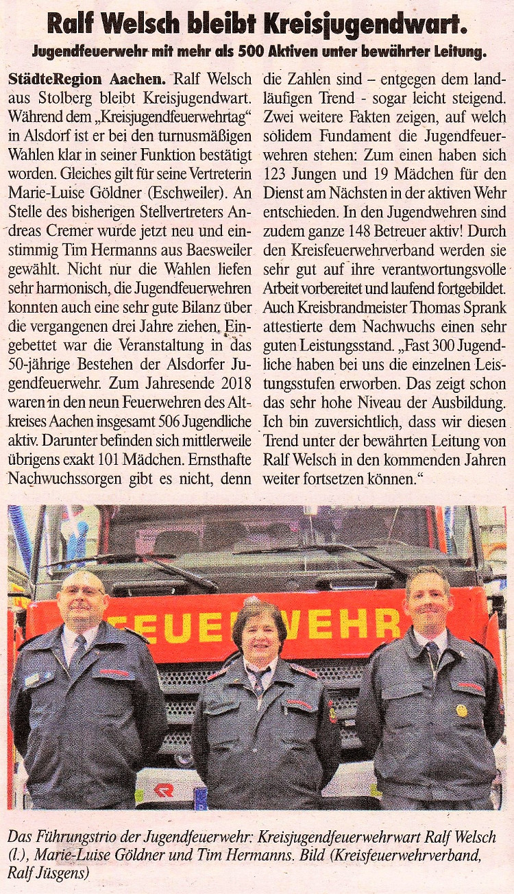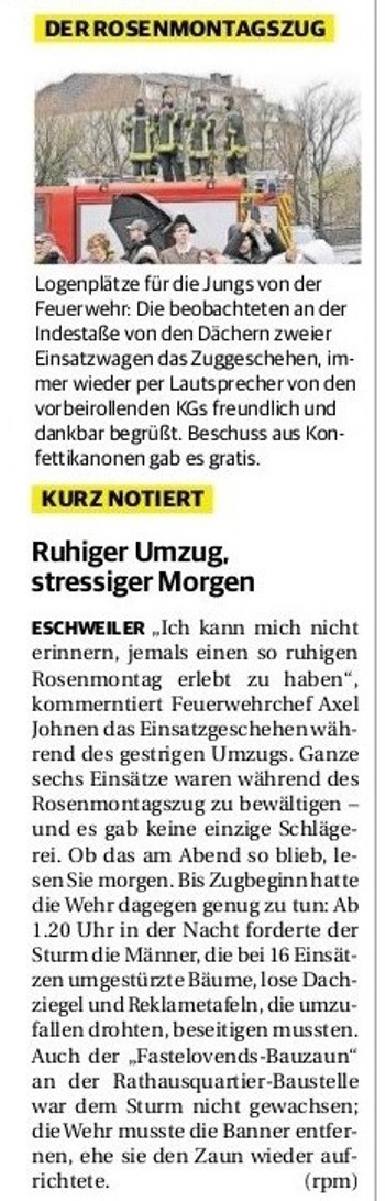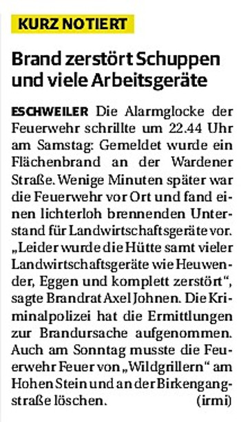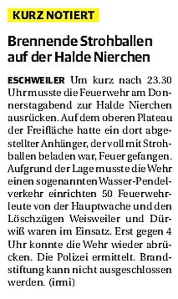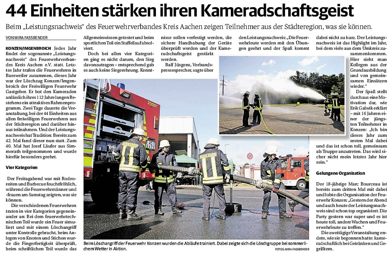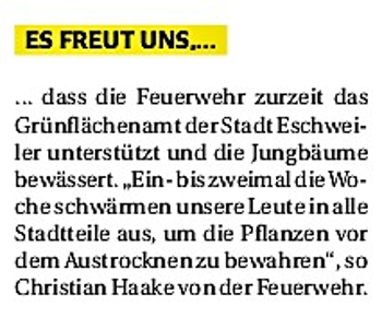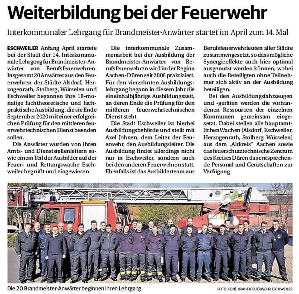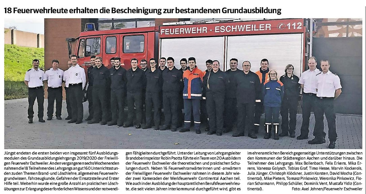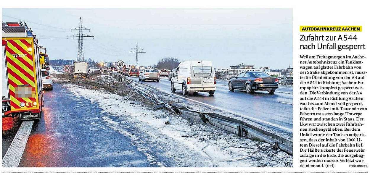 2019 30.12.2019 In Röhe brennt eine Sauna im Anbau aus EN / EZ 28.12.2019 A4 - Fahrzeuge krachen ineinander EN / EZ 16.12.2019 Kurz Notiert - Zwei wetterbedingte Einsätze EN / EZ 11.12.2019 Schwerer Unfall auf Rue de Wattrelos EN / EZ 22.11.2019 Kurz Notiert - Zwei Unfälle fordern vier Verletzte EN / EZ 20.11.2019 A4 dicht: LKW-Fahrer mit 2,3 Promille EN / EZ 10.11.2019 Delegiertentag des Kreisfeuerwehrverbands SuperSonntag 29.10.2019 Kurz Notiert - Angebranntes Essen EN / EZ 23.10.2019 18 Feuerwehrleute bestanden Grundausbildung EN / EZ 14.10.2019 Jugendfeuerwehr - Spiel ohne Grenzen EN / EZ 09.10.2019 Kreisjugendfeuerwehrtag in Alsdorf Filmpost 09.10.2019 Vier Verletzte auf Rue de Wattrelos EN / EZ 07.10.2019 Kurz Notiert - Küchenbrand EN / EZ 03.10.2019 Kurz Notiert - und - Unfall Auf Der A 4 EN / EZ 02.10.2019 Interkommunaler Brandmeisterlehrgang Filmpost 30.09.2019 Kurz Notiert - Baum drohte zu stürzen EN / EZ 30.09.2019 Jugendfeuerwehr trainiert in Lagerhalle EN / EZ 26.09.2019 Kurz Notiert - Trockene Löschteiche EN / EZ 23.09.2019 18 Jährige verliert Kontrolle über Auto EN / EZ 23.09.2019 Erneut Unfall im Blausteinsee EN / EZ 23.09.2019 Spektrakuläre Unfallszenarien: Schockraumtraining EN / EZ 20.09.2019 Der Einsatz, die Obduktion, die Fragen EN / EZ 19.09.2019 Mercedes ausgebrannt, zwei Verletzte bei Unfall EN / EZ 12.09.2019 Kurz Notiert - Gasalarm und Pkw-Brand EN / EZ 30.08.2019 Polizei ermittelt wegen Brandstiftung EN / EZ 28.08.2019 Mit Blaulicht aufs Fest EN / EZ 23.08.2019 Dachstuhl brennt in der Nacht komplett durch EN / EZ 21.08.2019 Das Feuerwehrorchester auf dem Marktplatz Filmpost 15.08.2019 Weit mehr als "nur" Brandschutz EN / EZ 10.08.2019 Training - Rettung von Großtieren EN / EZ 09.08.2019 Kurz Notiert - Feuerwehr holt Kind aus Aufzug EN / EZ 08.08.2019 BAB-A4 - PKW von LKW mitgeschleift EN / EZ 01.08.2019 Freiwillige Feuerwehr bewässert Jungbäume EN / EZ 31.07.2019 Gartenhaus und Schuppen in Flammen EN / EZ 30.07.2019 Rathausbrand EN / EZ 27.07.2019 Es freut uns - Feuerwehr unterstützt Grünflächenamt EN / EZ 22.07.2019 Unfall mit Party-Anhänger und Starkregeneinsätze EN / EZ 16.07.2019 Jugendfeuerwehren legen sich ins Zeug EN / EZ 09.07.2019 Drei Gartenhäuser brennen nieder EN / EZ 06.07.2019 Von Ballenpresse ausgelöster Feldbrand EN / EZ 05.07.2019 Ein nagelneues Löschfahrzeug "für umsonst" EN / EZ 03.07.2019 Rue de Wattrelos - LKW-Anhänger kippt um EN / EZ 28.06.2019 Kurz Notiert - "Spiel ohne Grenzen" ist abgesagt EN / EZ 26.06.2019 Kat-Schutz - Zehn neue Fahrzeuge übergeben EN / EZ 24.06.2019 "Spiel ohne Grenzen" bei der Jugendfeuerwehr EN / EZ 19.06.2019 Der Leistungsnachweis in Konzen / Imgenbroich EN / EZ 01.06.2019 Info - Rettungskräfte angegriffen EN / EZ 28.05.2019 Kurz Notiert - Brand zerstört Schuppen EN / EZ 24.05.2019 Jugendfeuerwehr - Ein Tag ohne Einsatzübung EN / EZ 16.05.2019 Gartenhaus brennt EN / EZ 15.05.2019 Ein Schwerverletzter, Haus unbewohnbar EN / EZ 04.05.2019 Internationaler Tag der Feuerwehrleute - 2 EN / EZ 04.05.2019 Internationaler Tag der Feuerwehrleute - 1 EN / EZ 29.04.2019 Wenn das E-Auto in Flammen steht EN / EZ 27.04.2019 Neuer Rettungswagen für Feuerwehr EN / EZ 20.04.2019 Brennender Durchlauferhitzer EN / EZ 13.04.2019 Kurz Notiert - Strohballen brennen EN / EZ 11.04.2019 Der 14. interkommunale Brandmeisterlehrgang EN / EZ 04.04.2019 Kurz Notiert - Ölspur EN / EZ 01.04.2019 Die Jahreshauptversammlung der Feuerwehr EN / EZ 28.03.2019 Wohnung in Mehrfamilienhaus brennt aus EN / EZ 25.03.2019 80 Mädchen und Jungen im Einsatz EN / EZ 13.03.2019 Großeinsatz der Wehr EN / EZ 12.03.2019 Einsätze im Takt von 5 Minuten EN / EZ 11.03.2019 Trauerweide umgestürzt EN / EZ 08.03.2019 Kurz Notiert - Drei Einsätze binnen kurzer Zeit EN / EZ 06.03.2019 Schlussbilanz zu Rosenmontag EN / EZ 05.03.2019 Rosenmontag - Kurz notiert EN / EZ 04.03.2019 Prinzenempfang am Florianweg EN / EZ 02.03.2019 Es freut uns - Es ärgert uns EN / EZ 01.03.2019 Donnerstag - 14-Jährige liefert traurigen Ausrutscher EN / EZ 27.02.2019 Städteregion - Mehr Jugendfeuerwehrmitglieder EN / EZ 18.02.2019 Transporter stürzt auf der A 4 um EN / EZ 15.02.2019 Eine angesägte Gasleitung EN / EZ 06.02.2019 Kehrmaschine zieht Ölspur durch die Stadt EN / EZ 02.02.2019 Zufahrt zur A 544 nach Unfall gesperrt EN / EZ 30.01.2019 Auch Helfer brauchen manchmal Hilfe EN / EZ 29.01.2019 Liebes Tagebuch - In Sachen Bahnschranke EN / EZ 28.01.2019 Einige Einsätze für die Wehr EN / EZ 17.01.2019 Es Freut Uns - Feuerwehr reagierte sofort EN / EZ 02.01.2019 Von ruhigem Jahreswechsel keine Rede EN / EZ