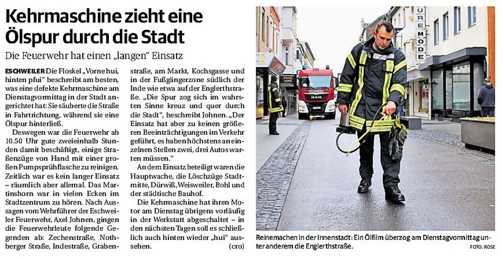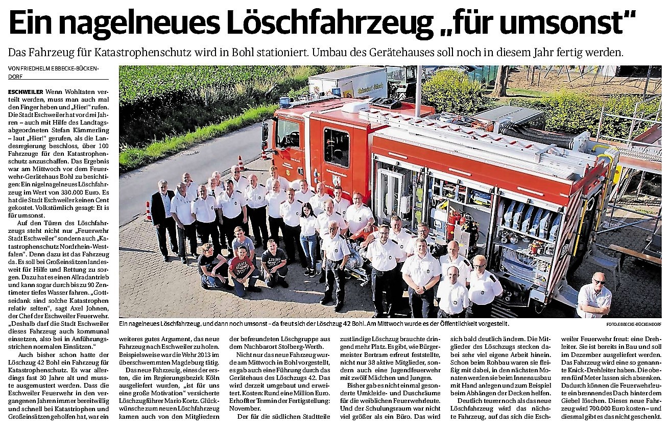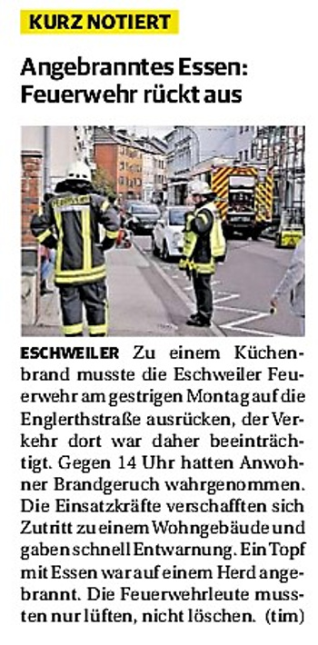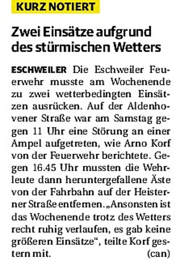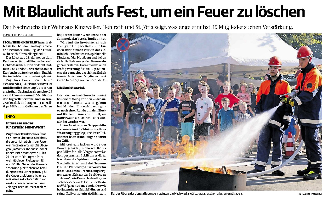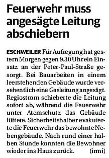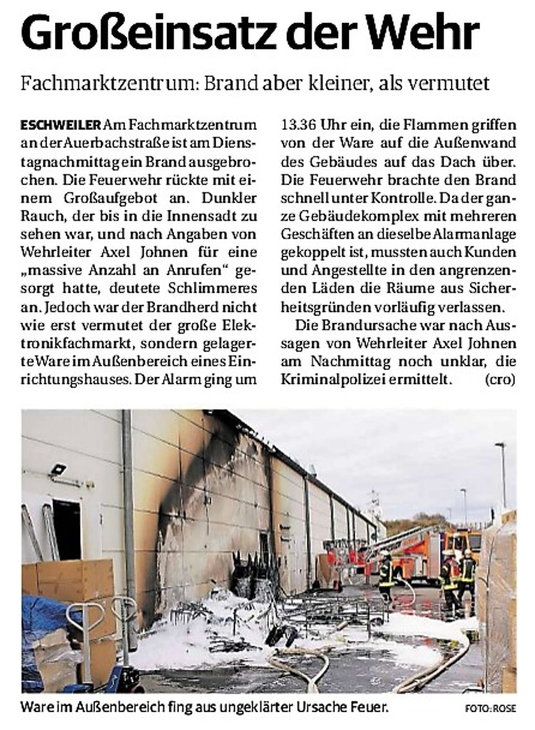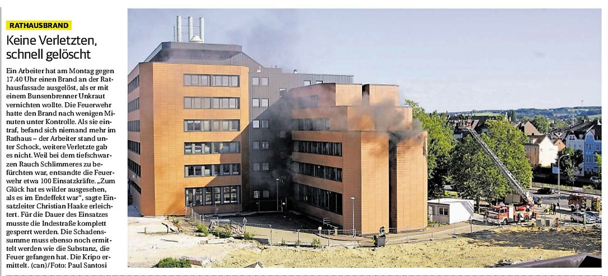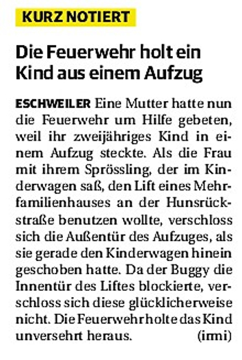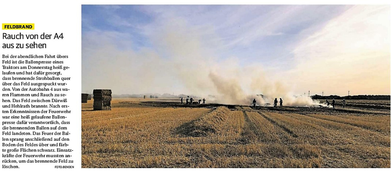 2019 30.12.2019 In Röhe brennt eine Sauna im Anbau aus EN / EZ 28.12.2019 A4 - Fahrzeuge krachen ineinander EN / EZ 16.12.2019 Kurz Notiert - Zwei wetterbedingte Einsätze EN / EZ 11.12.2019 Schwerer Unfall auf Rue de Wattrelos EN / EZ 22.11.2019 Kurz Notiert - Zwei Unfälle fordern vier Verletzte EN / EZ 20.11.2019 A4 dicht: LKW-Fahrer mit 2,3 Promille EN / EZ 10.11.2019 Delegiertentag des Kreisfeuerwehrverbands SuperSonntag 29.10.2019 Kurz Notiert - Angebranntes Essen EN / EZ 23.10.2019 18 Feuerwehrleute bestanden Grundausbildung EN / EZ 14.10.2019 Jugendfeuerwehr - Spiel ohne Grenzen EN / EZ 09.10.2019 Kreisjugendfeuerwehrtag in Alsdorf Filmpost 09.10.2019 Vier Verletzte auf Rue de Wattrelos EN / EZ 07.10.2019 Kurz Notiert - Küchenbrand EN / EZ 03.10.2019 Kurz Notiert - und - Unfall Auf Der A 4 EN / EZ 02.10.2019 Interkommunaler Brandmeisterlehrgang Filmpost 30.09.2019 Kurz Notiert - Baum drohte zu stürzen EN / EZ 30.09.2019 Jugendfeuerwehr trainiert in Lagerhalle EN / EZ 26.09.2019 Kurz Notiert - Trockene Löschteiche EN / EZ 23.09.2019 18 Jährige verliert Kontrolle über Auto EN / EZ 23.09.2019 Erneut Unfall im Blausteinsee EN / EZ 23.09.2019 Spektrakuläre Unfallszenarien: Schockraumtraining EN / EZ 20.09.2019 Der Einsatz, die Obduktion, die Fragen EN / EZ 19.09.2019 Mercedes ausgebrannt, zwei Verletzte bei Unfall EN / EZ 12.09.2019 Kurz Notiert - Gasalarm und Pkw-Brand EN / EZ 30.08.2019 Polizei ermittelt wegen Brandstiftung EN / EZ 28.08.2019 Mit Blaulicht aufs Fest EN / EZ 23.08.2019 Dachstuhl brennt in der Nacht komplett durch EN / EZ 21.08.2019 Das Feuerwehrorchester auf dem Marktplatz Filmpost 15.08.2019 Weit mehr als "nur" Brandschutz EN / EZ 10.08.2019 Training - Rettung von Großtieren EN / EZ 09.08.2019 Kurz Notiert - Feuerwehr holt Kind aus Aufzug EN / EZ 08.08.2019 BAB-A4 - PKW von LKW mitgeschleift EN / EZ 01.08.2019 Freiwillige Feuerwehr bewässert Jungbäume EN / EZ 31.07.2019 Gartenhaus und Schuppen in Flammen EN / EZ 30.07.2019 Rathausbrand EN / EZ 27.07.2019 Es freut uns - Feuerwehr unterstützt Grünflächenamt EN / EZ 22.07.2019 Unfall mit Party-Anhänger und Starkregeneinsätze EN / EZ 16.07.2019 Jugendfeuerwehren legen sich ins Zeug EN / EZ 09.07.2019 Drei Gartenhäuser brennen nieder EN / EZ 06.07.2019 Von Ballenpresse ausgelöster Feldbrand EN / EZ 05.07.2019 Ein nagelneues Löschfahrzeug "für umsonst" EN / EZ 03.07.2019 Rue de Wattrelos - LKW-Anhänger kippt um EN / EZ 28.06.2019 Kurz Notiert - "Spiel ohne Grenzen" ist abgesagt EN / EZ 26.06.2019 Kat-Schutz - Zehn neue Fahrzeuge übergeben EN / EZ 24.06.2019 "Spiel ohne Grenzen" bei der Jugendfeuerwehr EN / EZ 19.06.2019 Der Leistungsnachweis in Konzen / Imgenbroich EN / EZ 01.06.2019 Info - Rettungskräfte angegriffen EN / EZ 28.05.2019 Kurz Notiert - Brand zerstört Schuppen EN / EZ 24.05.2019 Jugendfeuerwehr - Ein Tag ohne Einsatzübung EN / EZ 16.05.2019 Gartenhaus brennt EN / EZ 15.05.2019 Ein Schwerverletzter, Haus unbewohnbar EN / EZ 04.05.2019 Internationaler Tag der Feuerwehrleute - 2 EN / EZ 04.05.2019 Internationaler Tag der Feuerwehrleute - 1 EN / EZ 29.04.2019 Wenn das E-Auto in Flammen steht EN / EZ 27.04.2019 Neuer Rettungswagen für Feuerwehr EN / EZ 20.04.2019 Brennender Durchlauferhitzer EN / EZ 13.04.2019 Kurz Notiert - Strohballen brennen EN / EZ 11.04.2019 Der 14. interkommunale Brandmeisterlehrgang EN / EZ 04.04.2019 Kurz Notiert - Ölspur EN / EZ 01.04.2019 Die Jahreshauptversammlung der Feuerwehr EN / EZ 28.03.2019 Wohnung in Mehrfamilienhaus brennt aus EN / EZ 25.03.2019 80 Mädchen und Jungen im Einsatz EN / EZ 13.03.2019 Großeinsatz der Wehr EN / EZ 12.03.2019 Einsätze im Takt von 5 Minuten EN / EZ 11.03.2019 Trauerweide umgestürzt EN / EZ 08.03.2019 Kurz Notiert - Drei Einsätze binnen kurzer Zeit EN / EZ 06.03.2019 Schlussbilanz zu Rosenmontag EN / EZ 05.03.2019 Rosenmontag - Kurz notiert EN / EZ 04.03.2019 Prinzenempfang am Florianweg EN / EZ 02.03.2019 Es freut uns - Es ärgert uns EN / EZ 01.03.2019 Donnerstag - 14-Jährige liefert traurigen Ausrutscher EN / EZ 27.02.2019 Städteregion - Mehr Jugendfeuerwehrmitglieder EN / EZ 18.02.2019 Transporter stürzt auf der A 4 um EN / EZ 15.02.2019 Eine angesägte Gasleitung EN / EZ 06.02.2019 Kehrmaschine zieht Ölspur durch die Stadt EN / EZ 02.02.2019 Zufahrt zur A 544 nach Unfall gesperrt EN / EZ 30.01.2019 Auch Helfer brauchen manchmal Hilfe EN / EZ 29.01.2019 Liebes Tagebuch - In Sachen Bahnschranke EN / EZ 28.01.2019 Einige Einsätze für die Wehr EN / EZ 17.01.2019 Es Freut Uns - Feuerwehr reagierte sofort EN / EZ 02.01.2019 Von ruhigem Jahreswechsel keine Rede EN / EZ