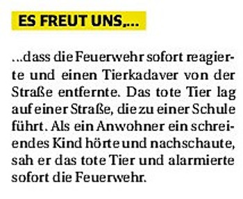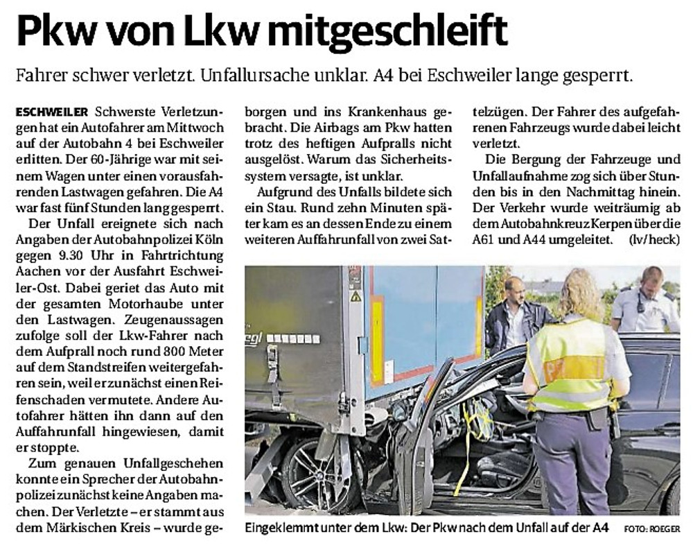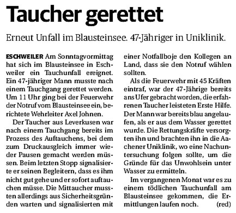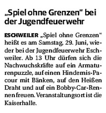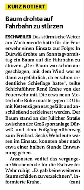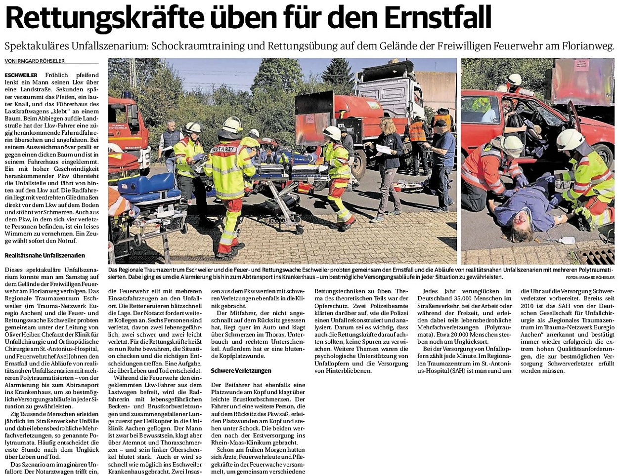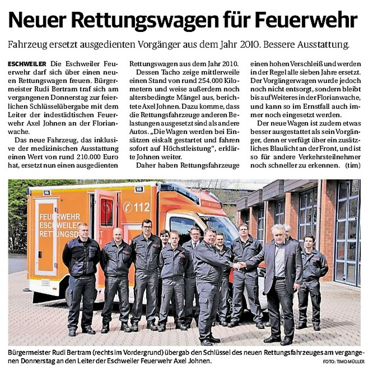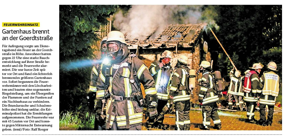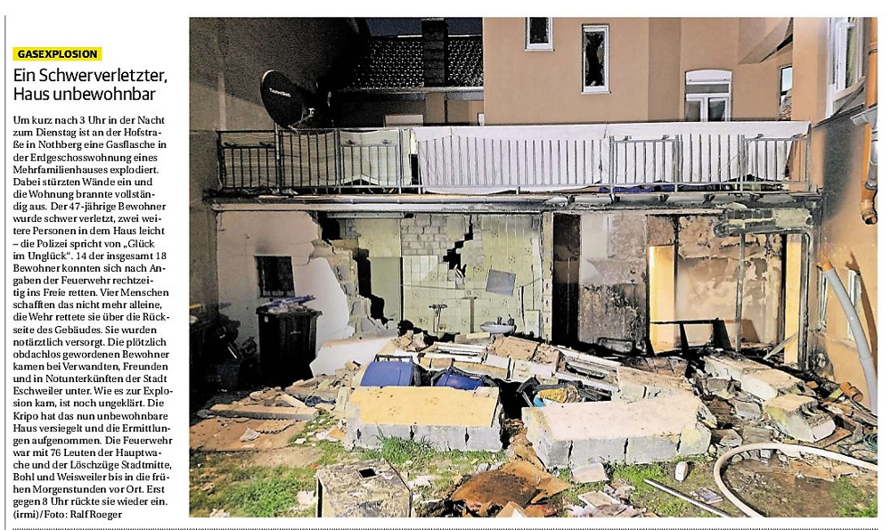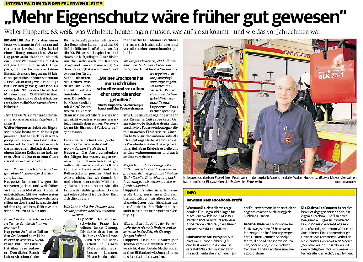 2019 30.12.2019 In Röhe brennt eine Sauna im Anbau aus EN / EZ 28.12.2019 A4 - Fahrzeuge krachen ineinander EN / EZ 16.12.2019 Kurz Notiert - Zwei wetterbedingte Einsätze EN / EZ 11.12.2019 Schwerer Unfall auf Rue de Wattrelos EN / EZ 22.11.2019 Kurz Notiert - Zwei Unfälle fordern vier Verletzte EN / EZ 20.11.2019 A4 dicht: LKW-Fahrer mit 2,3 Promille EN / EZ 10.11.2019 Delegiertentag des Kreisfeuerwehrverbands SuperSonntag 29.10.2019 Kurz Notiert - Angebranntes Essen EN / EZ 23.10.2019 18 Feuerwehrleute bestanden Grundausbildung EN / EZ 14.10.2019 Jugendfeuerwehr - Spiel ohne Grenzen EN / EZ 09.10.2019 Kreisjugendfeuerwehrtag in Alsdorf Filmpost 09.10.2019 Vier Verletzte auf Rue de Wattrelos EN / EZ 07.10.2019 Kurz Notiert - Küchenbrand EN / EZ 03.10.2019 Kurz Notiert - und - Unfall Auf Der A 4 EN / EZ 02.10.2019 Interkommunaler Brandmeisterlehrgang Filmpost 30.09.2019 Kurz Notiert - Baum drohte zu stürzen EN / EZ 30.09.2019 Jugendfeuerwehr trainiert in Lagerhalle EN / EZ 26.09.2019 Kurz Notiert - Trockene Löschteiche EN / EZ 23.09.2019 18 Jährige verliert Kontrolle über Auto EN / EZ 23.09.2019 Erneut Unfall im Blausteinsee EN / EZ 23.09.2019 Spektrakuläre Unfallszenarien: Schockraumtraining EN / EZ 20.09.2019 Der Einsatz, die Obduktion, die Fragen EN / EZ 19.09.2019 Mercedes ausgebrannt, zwei Verletzte bei Unfall EN / EZ 12.09.2019 Kurz Notiert - Gasalarm und Pkw-Brand EN / EZ 30.08.2019 Polizei ermittelt wegen Brandstiftung EN / EZ 28.08.2019 Mit Blaulicht aufs Fest EN / EZ 23.08.2019 Dachstuhl brennt in der Nacht komplett durch EN / EZ 21.08.2019 Das Feuerwehrorchester auf dem Marktplatz Filmpost 15.08.2019 Weit mehr als "nur" Brandschutz EN / EZ 10.08.2019 Training - Rettung von Großtieren EN / EZ 09.08.2019 Kurz Notiert - Feuerwehr holt Kind aus Aufzug EN / EZ 08.08.2019 BAB-A4 - PKW von LKW mitgeschleift EN / EZ 01.08.2019 Freiwillige Feuerwehr bewässert Jungbäume EN / EZ 31.07.2019 Gartenhaus und Schuppen in Flammen EN / EZ 30.07.2019 Rathausbrand EN / EZ 27.07.2019 Es freut uns - Feuerwehr unterstützt Grünflächenamt EN / EZ 22.07.2019 Unfall mit Party-Anhänger und Starkregeneinsätze EN / EZ 16.07.2019 Jugendfeuerwehren legen sich ins Zeug EN / EZ 09.07.2019 Drei Gartenhäuser brennen nieder EN / EZ 06.07.2019 Von Ballenpresse ausgelöster Feldbrand EN / EZ 05.07.2019 Ein nagelneues Löschfahrzeug "für umsonst" EN / EZ 03.07.2019 Rue de Wattrelos - LKW-Anhänger kippt um EN / EZ 28.06.2019 Kurz Notiert - "Spiel ohne Grenzen" ist abgesagt EN / EZ 26.06.2019 Kat-Schutz - Zehn neue Fahrzeuge übergeben EN / EZ 24.06.2019 "Spiel ohne Grenzen" bei der Jugendfeuerwehr EN / EZ 19.06.2019 Der Leistungsnachweis in Konzen / Imgenbroich EN / EZ 01.06.2019 Info - Rettungskräfte angegriffen EN / EZ 28.05.2019 Kurz Notiert - Brand zerstört Schuppen EN / EZ 24.05.2019 Jugendfeuerwehr - Ein Tag ohne Einsatzübung EN / EZ 16.05.2019 Gartenhaus brennt EN / EZ 15.05.2019 Ein Schwerverletzter, Haus unbewohnbar EN / EZ 04.05.2019 Internationaler Tag der Feuerwehrleute - 2 EN / EZ 04.05.2019 Internationaler Tag der Feuerwehrleute - 1 EN / EZ 29.04.2019 Wenn das E-Auto in Flammen steht EN / EZ 27.04.2019 Neuer Rettungswagen für Feuerwehr EN / EZ 20.04.2019 Brennender Durchlauferhitzer EN / EZ 13.04.2019 Kurz Notiert - Strohballen brennen EN / EZ 11.04.2019 Der 14. interkommunale Brandmeisterlehrgang EN / EZ 04.04.2019 Kurz Notiert - Ölspur EN / EZ 01.04.2019 Die Jahreshauptversammlung der Feuerwehr EN / EZ 28.03.2019 Wohnung in Mehrfamilienhaus brennt aus EN / EZ 25.03.2019 80 Mädchen und Jungen im Einsatz EN / EZ 13.03.2019 Großeinsatz der Wehr EN / EZ 12.03.2019 Einsätze im Takt von 5 Minuten EN / EZ 11.03.2019 Trauerweide umgestürzt EN / EZ 08.03.2019 Kurz Notiert - Drei Einsätze binnen kurzer Zeit EN / EZ 06.03.2019 Schlussbilanz zu Rosenmontag EN / EZ 05.03.2019 Rosenmontag - Kurz notiert EN / EZ 04.03.2019 Prinzenempfang am Florianweg EN / EZ 02.03.2019 Es freut uns - Es ärgert uns EN / EZ 01.03.2019 Donnerstag - 14-Jährige liefert traurigen Ausrutscher EN / EZ 27.02.2019 Städteregion - Mehr Jugendfeuerwehrmitglieder EN / EZ 18.02.2019 Transporter stürzt auf der A 4 um EN / EZ 15.02.2019 Eine angesägte Gasleitung EN / EZ 06.02.2019 Kehrmaschine zieht Ölspur durch die Stadt EN / EZ 02.02.2019 Zufahrt zur A 544 nach Unfall gesperrt EN / EZ 30.01.2019 Auch Helfer brauchen manchmal Hilfe EN / EZ 29.01.2019 Liebes Tagebuch - In Sachen Bahnschranke EN / EZ 28.01.2019 Einige Einsätze für die Wehr EN / EZ 17.01.2019 Es Freut Uns - Feuerwehr reagierte sofort EN / EZ 02.01.2019 Von ruhigem Jahreswechsel keine Rede EN / EZ