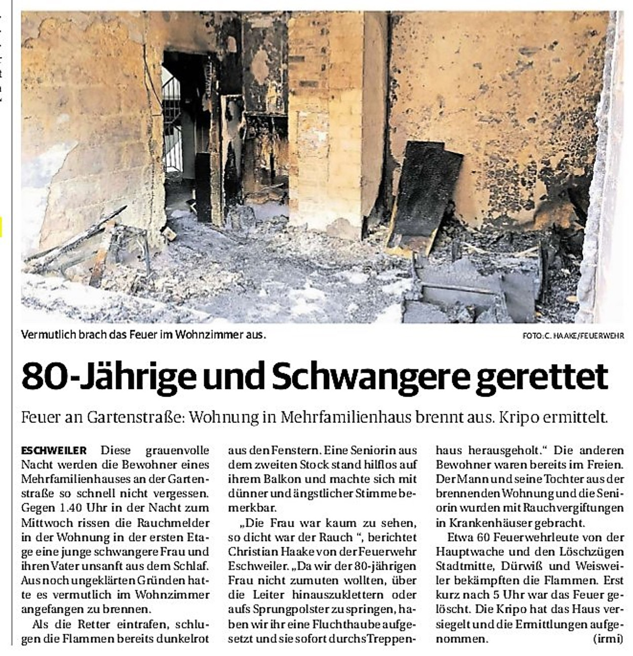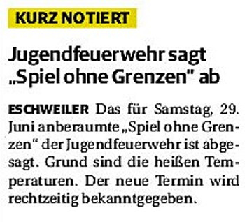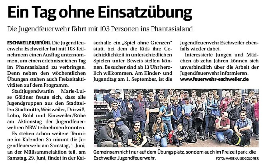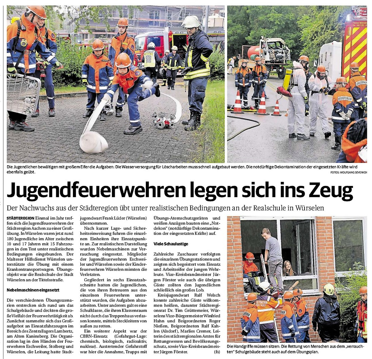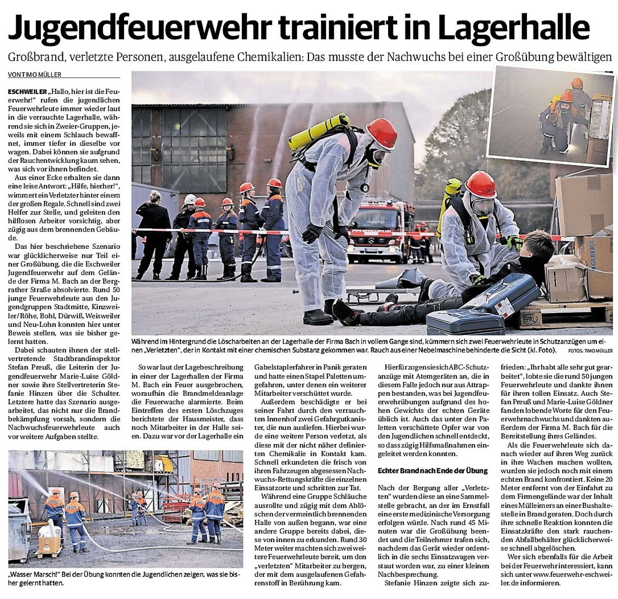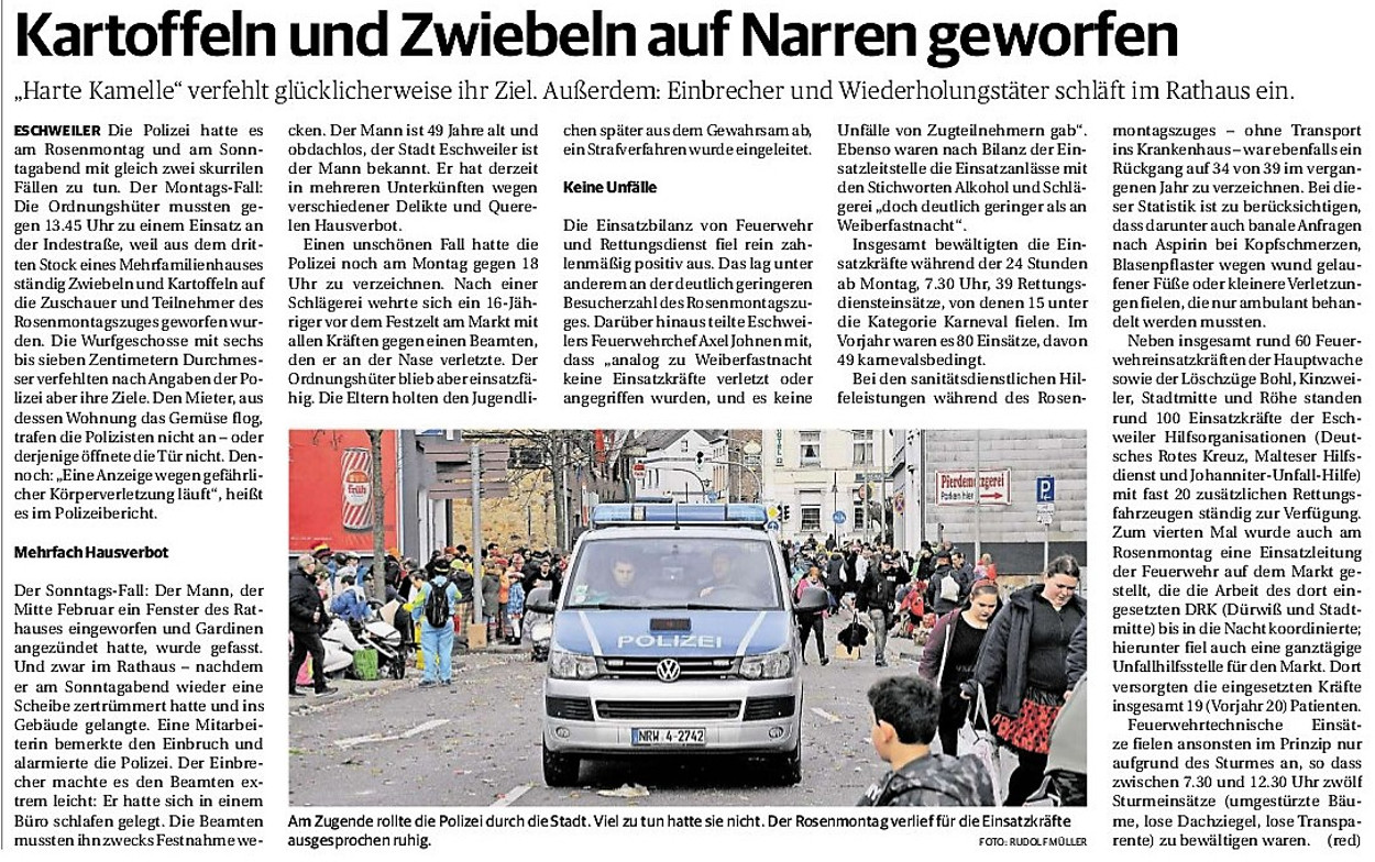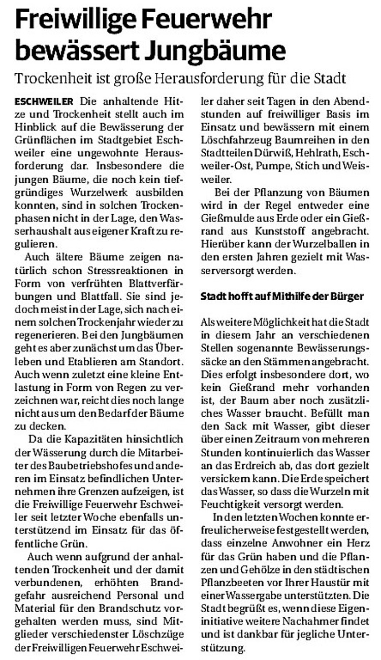 2019 30.12.2019 In Röhe brennt eine Sauna im Anbau aus EN / EZ 28.12.2019 A4 - Fahrzeuge krachen ineinander EN / EZ 16.12.2019 Kurz Notiert - Zwei wetterbedingte Einsätze EN / EZ 11.12.2019 Schwerer Unfall auf Rue de Wattrelos EN / EZ 22.11.2019 Kurz Notiert - Zwei Unfälle fordern vier Verletzte EN / EZ 20.11.2019 A4 dicht: LKW-Fahrer mit 2,3 Promille EN / EZ 10.11.2019 Delegiertentag des Kreisfeuerwehrverbands SuperSonntag 29.10.2019 Kurz Notiert - Angebranntes Essen EN / EZ 23.10.2019 18 Feuerwehrleute bestanden Grundausbildung EN / EZ 14.10.2019 Jugendfeuerwehr - Spiel ohne Grenzen EN / EZ 09.10.2019 Kreisjugendfeuerwehrtag in Alsdorf Filmpost 09.10.2019 Vier Verletzte auf Rue de Wattrelos EN / EZ 07.10.2019 Kurz Notiert - Küchenbrand EN / EZ 03.10.2019 Kurz Notiert - und - Unfall Auf Der A 4 EN / EZ 02.10.2019 Interkommunaler Brandmeisterlehrgang Filmpost 30.09.2019 Kurz Notiert - Baum drohte zu stürzen EN / EZ 30.09.2019 Jugendfeuerwehr trainiert in Lagerhalle EN / EZ 26.09.2019 Kurz Notiert - Trockene Löschteiche EN / EZ 23.09.2019 18 Jährige verliert Kontrolle über Auto EN / EZ 23.09.2019 Erneut Unfall im Blausteinsee EN / EZ 23.09.2019 Spektrakuläre Unfallszenarien: Schockraumtraining EN / EZ 20.09.2019 Der Einsatz, die Obduktion, die Fragen EN / EZ 19.09.2019 Mercedes ausgebrannt, zwei Verletzte bei Unfall EN / EZ 12.09.2019 Kurz Notiert - Gasalarm und Pkw-Brand EN / EZ 30.08.2019 Polizei ermittelt wegen Brandstiftung EN / EZ 28.08.2019 Mit Blaulicht aufs Fest EN / EZ 23.08.2019 Dachstuhl brennt in der Nacht komplett durch EN / EZ 21.08.2019 Das Feuerwehrorchester auf dem Marktplatz Filmpost 15.08.2019 Weit mehr als "nur" Brandschutz EN / EZ 10.08.2019 Training - Rettung von Großtieren EN / EZ 09.08.2019 Kurz Notiert - Feuerwehr holt Kind aus Aufzug EN / EZ 08.08.2019 BAB-A4 - PKW von LKW mitgeschleift EN / EZ 01.08.2019 Freiwillige Feuerwehr bewässert Jungbäume EN / EZ 31.07.2019 Gartenhaus und Schuppen in Flammen EN / EZ 30.07.2019 Rathausbrand EN / EZ 27.07.2019 Es freut uns - Feuerwehr unterstützt Grünflächenamt EN / EZ 22.07.2019 Unfall mit Party-Anhänger und Starkregeneinsätze EN / EZ 16.07.2019 Jugendfeuerwehren legen sich ins Zeug EN / EZ 09.07.2019 Drei Gartenhäuser brennen nieder EN / EZ 06.07.2019 Von Ballenpresse ausgelöster Feldbrand EN / EZ 05.07.2019 Ein nagelneues Löschfahrzeug "für umsonst" EN / EZ 03.07.2019 Rue de Wattrelos - LKW-Anhänger kippt um EN / EZ 28.06.2019 Kurz Notiert - "Spiel ohne Grenzen" ist abgesagt EN / EZ 26.06.2019 Kat-Schutz - Zehn neue Fahrzeuge übergeben EN / EZ 24.06.2019 "Spiel ohne Grenzen" bei der Jugendfeuerwehr EN / EZ 19.06.2019 Der Leistungsnachweis in Konzen / Imgenbroich EN / EZ 01.06.2019 Info - Rettungskräfte angegriffen EN / EZ 28.05.2019 Kurz Notiert - Brand zerstört Schuppen EN / EZ 24.05.2019 Jugendfeuerwehr - Ein Tag ohne Einsatzübung EN / EZ 16.05.2019 Gartenhaus brennt EN / EZ 15.05.2019 Ein Schwerverletzter, Haus unbewohnbar EN / EZ 04.05.2019 Internationaler Tag der Feuerwehrleute - 2 EN / EZ 04.05.2019 Internationaler Tag der Feuerwehrleute - 1 EN / EZ 29.04.2019 Wenn das E-Auto in Flammen steht EN / EZ 27.04.2019 Neuer Rettungswagen für Feuerwehr EN / EZ 20.04.2019 Brennender Durchlauferhitzer EN / EZ 13.04.2019 Kurz Notiert - Strohballen brennen EN / EZ 11.04.2019 Der 14. interkommunale Brandmeisterlehrgang EN / EZ 04.04.2019 Kurz Notiert - Ölspur EN / EZ 01.04.2019 Die Jahreshauptversammlung der Feuerwehr EN / EZ 28.03.2019 Wohnung in Mehrfamilienhaus brennt aus EN / EZ 25.03.2019 80 Mädchen und Jungen im Einsatz EN / EZ 13.03.2019 Großeinsatz der Wehr EN / EZ 12.03.2019 Einsätze im Takt von 5 Minuten EN / EZ 11.03.2019 Trauerweide umgestürzt EN / EZ 08.03.2019 Kurz Notiert - Drei Einsätze binnen kurzer Zeit EN / EZ 06.03.2019 Schlussbilanz zu Rosenmontag EN / EZ 05.03.2019 Rosenmontag - Kurz notiert EN / EZ 04.03.2019 Prinzenempfang am Florianweg EN / EZ 02.03.2019 Es freut uns - Es ärgert uns EN / EZ 01.03.2019 Donnerstag - 14-Jährige liefert traurigen Ausrutscher EN / EZ 27.02.2019 Städteregion - Mehr Jugendfeuerwehrmitglieder EN / EZ 18.02.2019 Transporter stürzt auf der A 4 um EN / EZ 15.02.2019 Eine angesägte Gasleitung EN / EZ 06.02.2019 Kehrmaschine zieht Ölspur durch die Stadt EN / EZ 02.02.2019 Zufahrt zur A 544 nach Unfall gesperrt EN / EZ 30.01.2019 Auch Helfer brauchen manchmal Hilfe EN / EZ 29.01.2019 Liebes Tagebuch - In Sachen Bahnschranke EN / EZ 28.01.2019 Einige Einsätze für die Wehr EN / EZ 17.01.2019 Es Freut Uns - Feuerwehr reagierte sofort EN / EZ 02.01.2019 Von ruhigem Jahreswechsel keine Rede EN / EZ