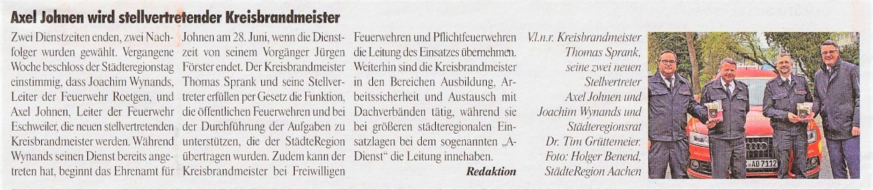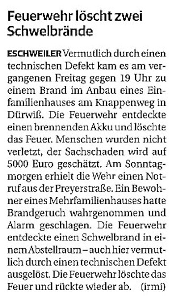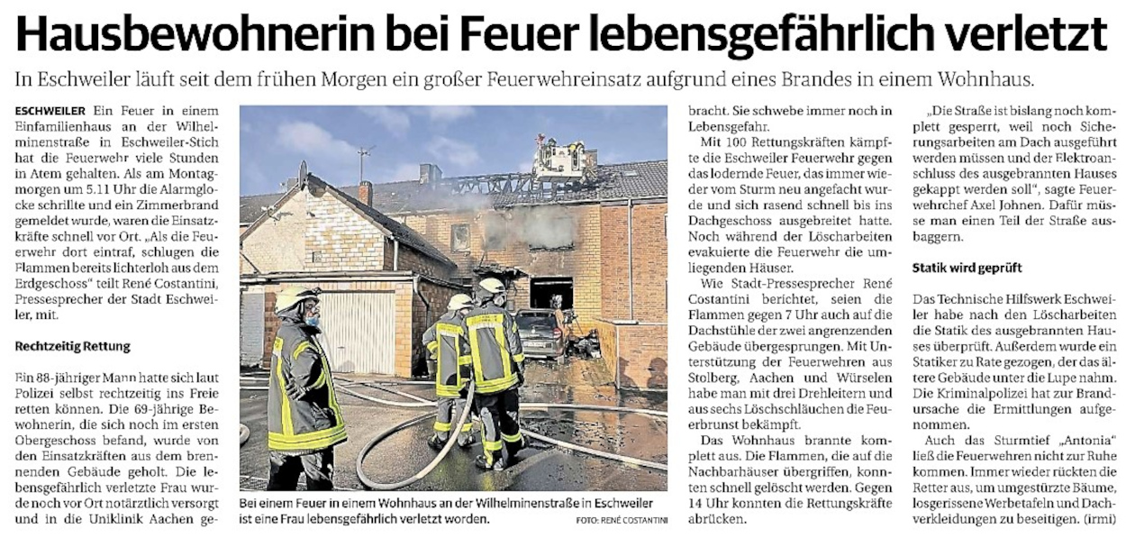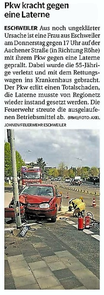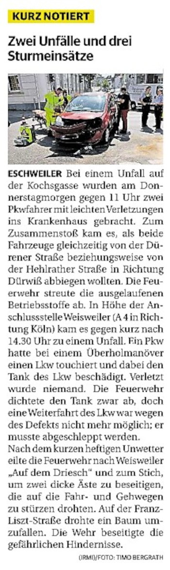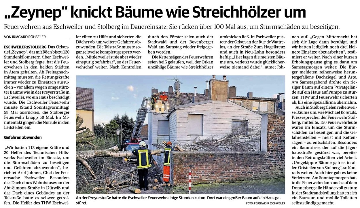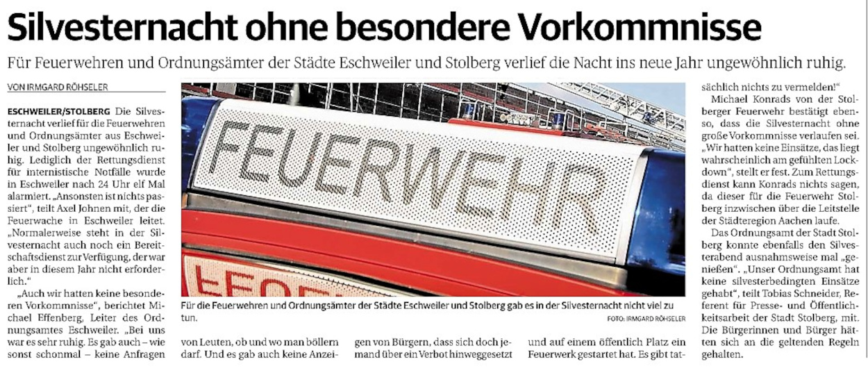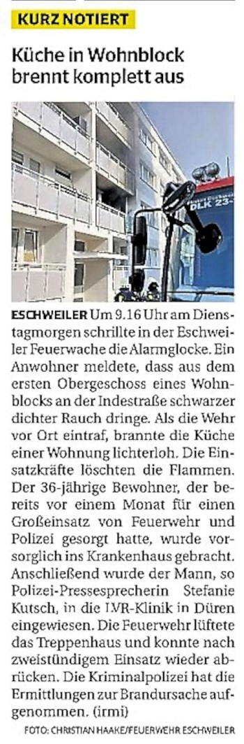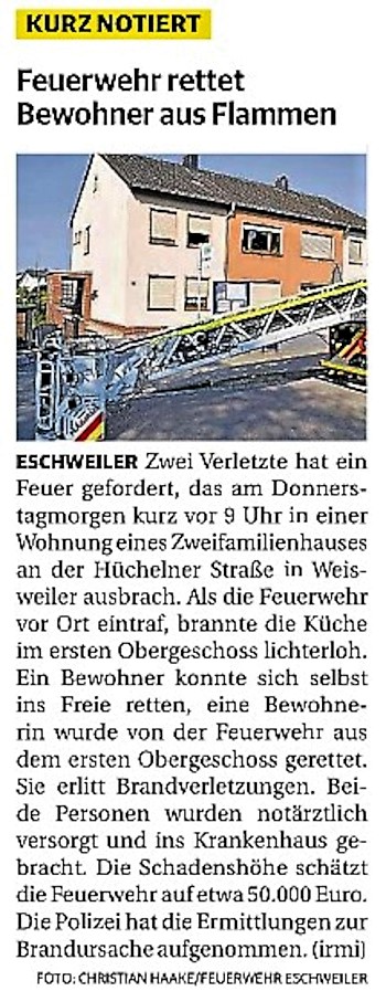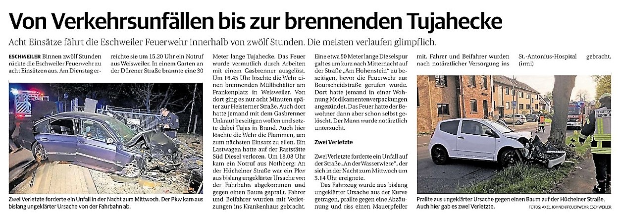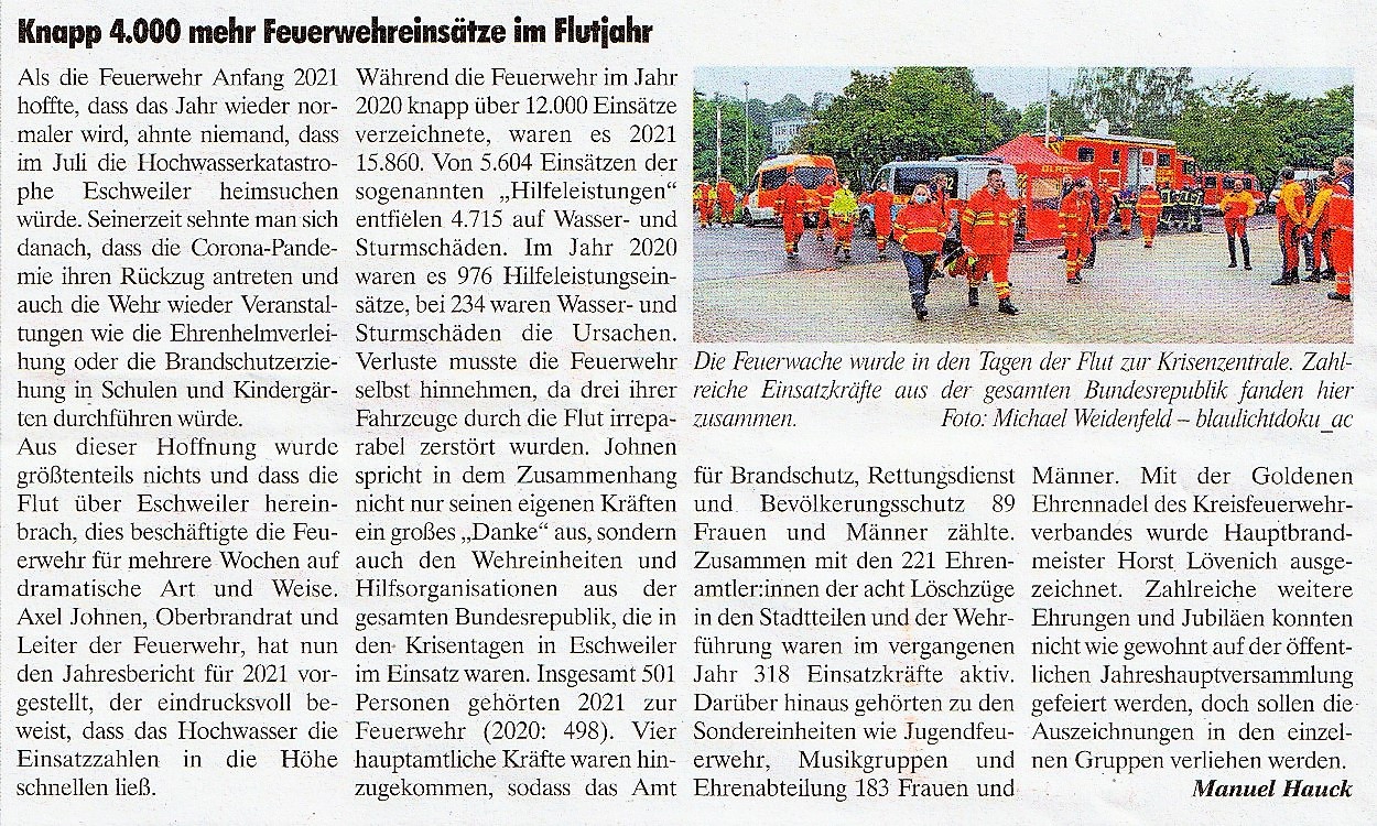 2022 07.06.2022 Wassereinsätze der Eschweiler Feuerwehr EN / EZ 05.06.2022 Knapp 4000 mehr Feuerwehreinsätze im Flutjahr Filmpost 30.05.2022 Rettungsdienst stärken, Krankentransport abgeben EN / EZ 24.05.2022 Brand beschäftigt Feuerwehr die ganze Nacht EN / EZ 20.05.2022 Kurz Notiert - Zwei Unfälle und drei Sturmeinsätze EN / EZ 11.05.2022 Drei Verletzte auf der L 240 EN / EZ 05.05.2022 Kurz Notiert - Feuerwehr rettet Fuchsbaby EN / EZ 04.05.2022 Kurz Notiert - Küche brennt komplett aus EN / EZ 29.04.2022 Kurz Notiert - Feuerwehr rettet Bewohner EN / EZ 23.04.2022 Kurz Notiert - Pkw kracht gegen eine Laterne EN / EZ 21.04.2022 Von Verkehrsunfällen bis zur brennenden Tujahecke EN / EZ 12.04.2022 Kurz Notiert - Betrunken auf dem Dach gelandet EN / EZ 09.04.2022 Autos kollidieren auf der Jülicher Straße EN / EZ 06.04.2022 Axel Johnen wird stellvertretender Kreisbrandmeister Filmpost 30.03.2022 Kurz Notiert - Eine Schwerverletzte EN / EZ 29.03.2022 Feuerwehr löscht zwei Schwelbrände EN / EZ 17.03.2022 Mit ganzem Herzen Feuerwehrmann EN / EZ 07.03.2022 Kurz Notiert - Auto durchbricht Brückengeländer EN / EZ 02.03.2022 Kurz Notiert - Schwerer Unfall auf der A4 EN / EZ 26.02.2022 Kurz Notiert - Polizei schließt Brandstiftung aus EN / EZ 22.02.2022 Hausbewohnerin bei Feuer lebensgefährlich verletzt EN / EZ 21.02.2022 "Zeynep" knickt Bäume wie Streichhölzer um EN / EZ 18.02.2022 Sturmtief Ylenia legt reihenweise Bäume um EN / EZ 08.02.2022 Hohe Pegelstände, aber keine Gefahr EN / EZ 22.01.2022 Kurz Notiert - Ältere Frau erleidet Rauchvergiftung EN / EZ 16.01.2022 Feuerwehrorchester spielt digitales Benefizkonzert Zeitung am Sonntag 11.01.2022 Meldesystem für Gewalt gegen Einsatzkräfte EN / EZ 04.01.2022 Silvesternacht ohne besondere Vorkommnisse EN / EZ 02.01.2022 Investment in die Sicherheit aller Zeitung am Sonntag