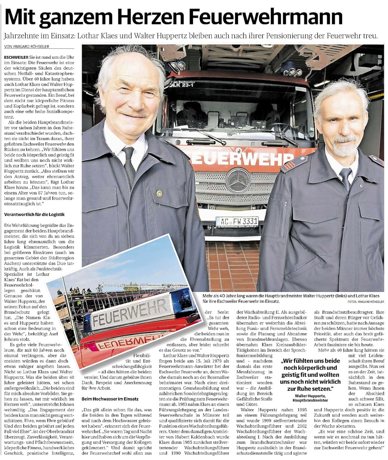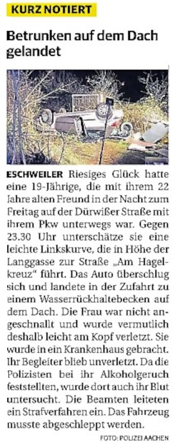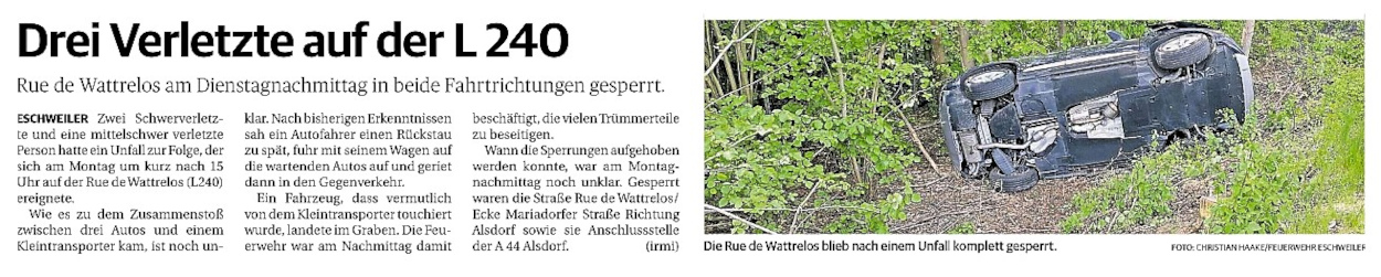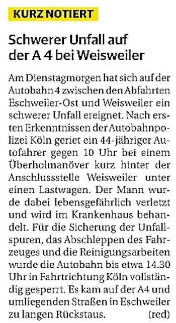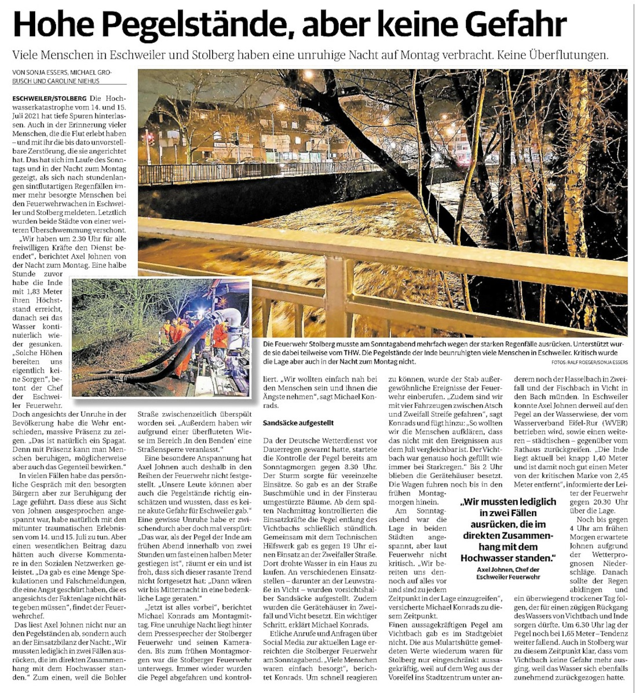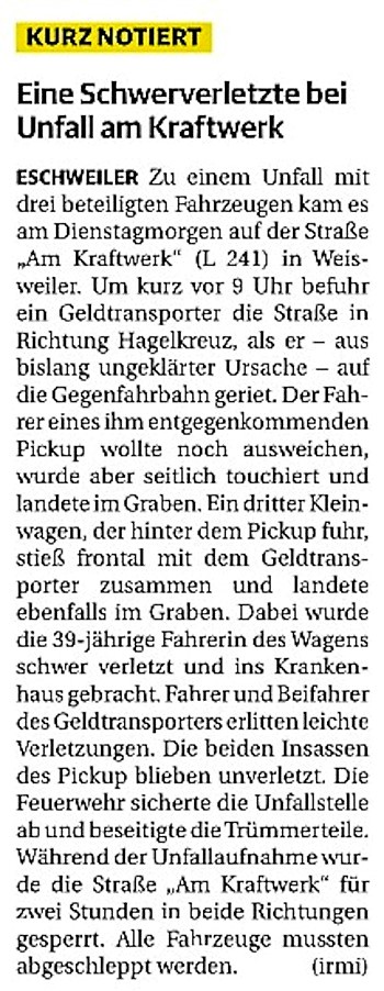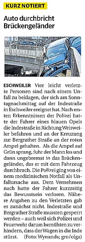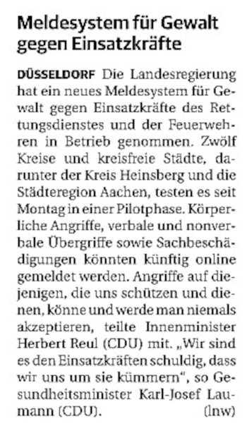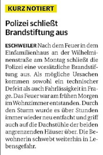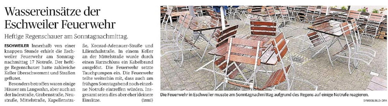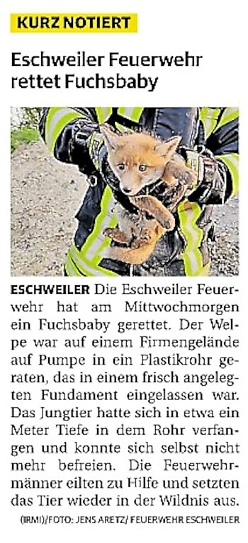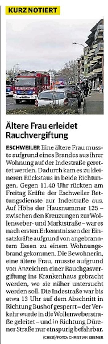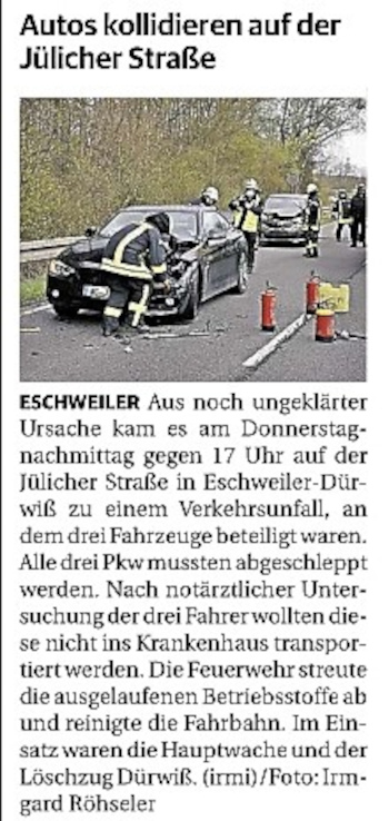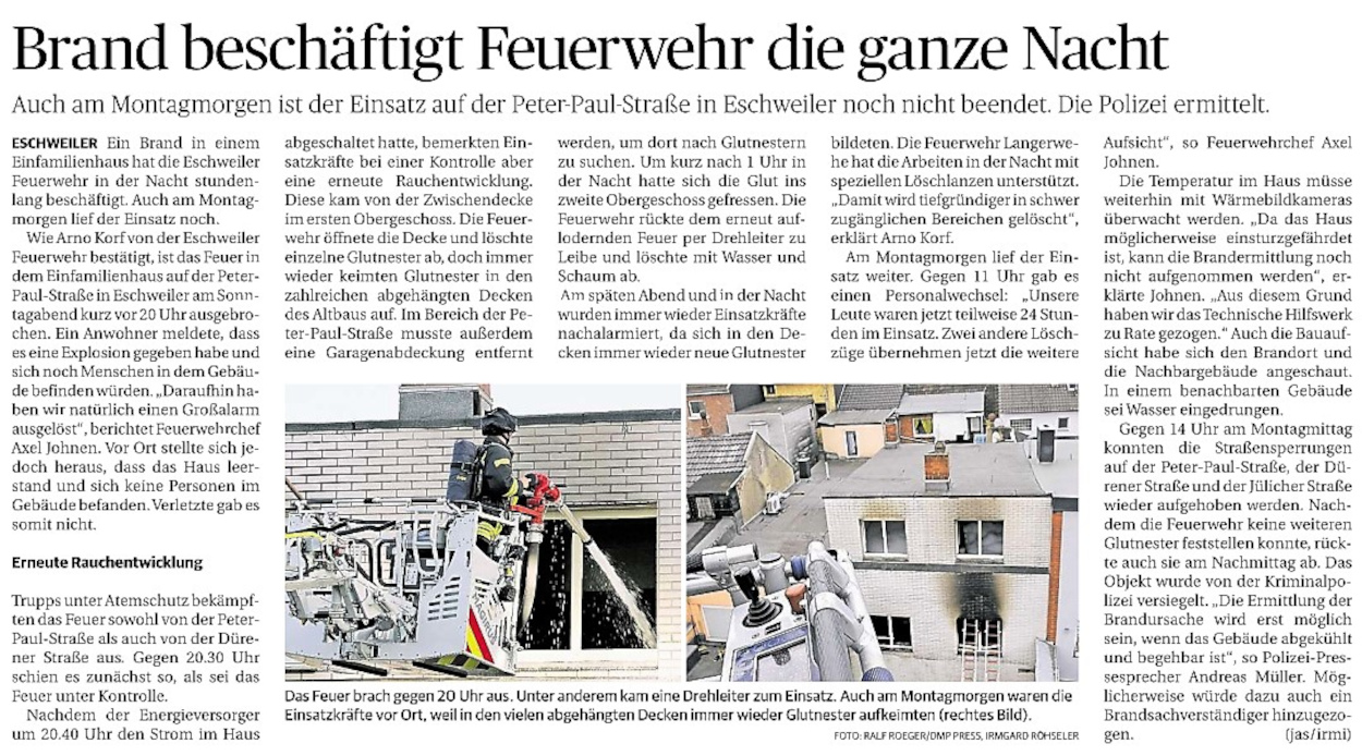 2022 07.06.2022 Wassereinsätze der Eschweiler Feuerwehr EN / EZ 05.06.2022 Knapp 4000 mehr Feuerwehreinsätze im Flutjahr Filmpost 30.05.2022 Rettungsdienst stärken, Krankentransport abgeben EN / EZ 24.05.2022 Brand beschäftigt Feuerwehr die ganze Nacht EN / EZ 20.05.2022 Kurz Notiert - Zwei Unfälle und drei Sturmeinsätze EN / EZ 11.05.2022 Drei Verletzte auf der L 240 EN / EZ 05.05.2022 Kurz Notiert - Feuerwehr rettet Fuchsbaby EN / EZ 04.05.2022 Kurz Notiert - Küche brennt komplett aus EN / EZ 29.04.2022 Kurz Notiert - Feuerwehr rettet Bewohner EN / EZ 23.04.2022 Kurz Notiert - Pkw kracht gegen eine Laterne EN / EZ 21.04.2022 Von Verkehrsunfällen bis zur brennenden Tujahecke EN / EZ 12.04.2022 Kurz Notiert - Betrunken auf dem Dach gelandet EN / EZ 09.04.2022 Autos kollidieren auf der Jülicher Straße EN / EZ 06.04.2022 Axel Johnen wird stellvertretender Kreisbrandmeister Filmpost 30.03.2022 Kurz Notiert - Eine Schwerverletzte EN / EZ 29.03.2022 Feuerwehr löscht zwei Schwelbrände EN / EZ 17.03.2022 Mit ganzem Herzen Feuerwehrmann EN / EZ 07.03.2022 Kurz Notiert - Auto durchbricht Brückengeländer EN / EZ 02.03.2022 Kurz Notiert - Schwerer Unfall auf der A4 EN / EZ 26.02.2022 Kurz Notiert - Polizei schließt Brandstiftung aus EN / EZ 22.02.2022 Hausbewohnerin bei Feuer lebensgefährlich verletzt EN / EZ 21.02.2022 "Zeynep" knickt Bäume wie Streichhölzer um EN / EZ 18.02.2022 Sturmtief Ylenia legt reihenweise Bäume um EN / EZ 08.02.2022 Hohe Pegelstände, aber keine Gefahr EN / EZ 22.01.2022 Kurz Notiert - Ältere Frau erleidet Rauchvergiftung EN / EZ 16.01.2022 Feuerwehrorchester spielt digitales Benefizkonzert Zeitung am Sonntag 11.01.2022 Meldesystem für Gewalt gegen Einsatzkräfte EN / EZ 04.01.2022 Silvesternacht ohne besondere Vorkommnisse EN / EZ 02.01.2022 Investment in die Sicherheit aller Zeitung am Sonntag